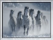 Grafika AI, Galop, Konie, Siwki, Zima, Śnieg