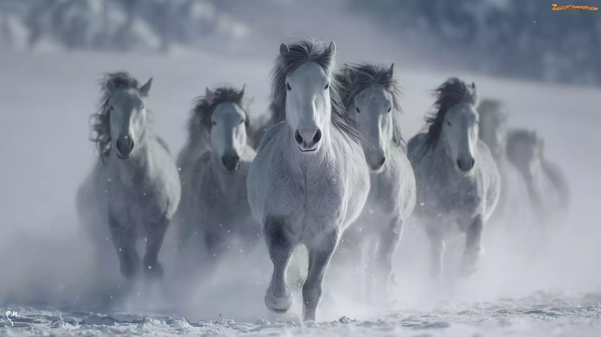 Zdjęcie: Grafika AI, Galop, Konie, Siwki, Zima, Śnieg