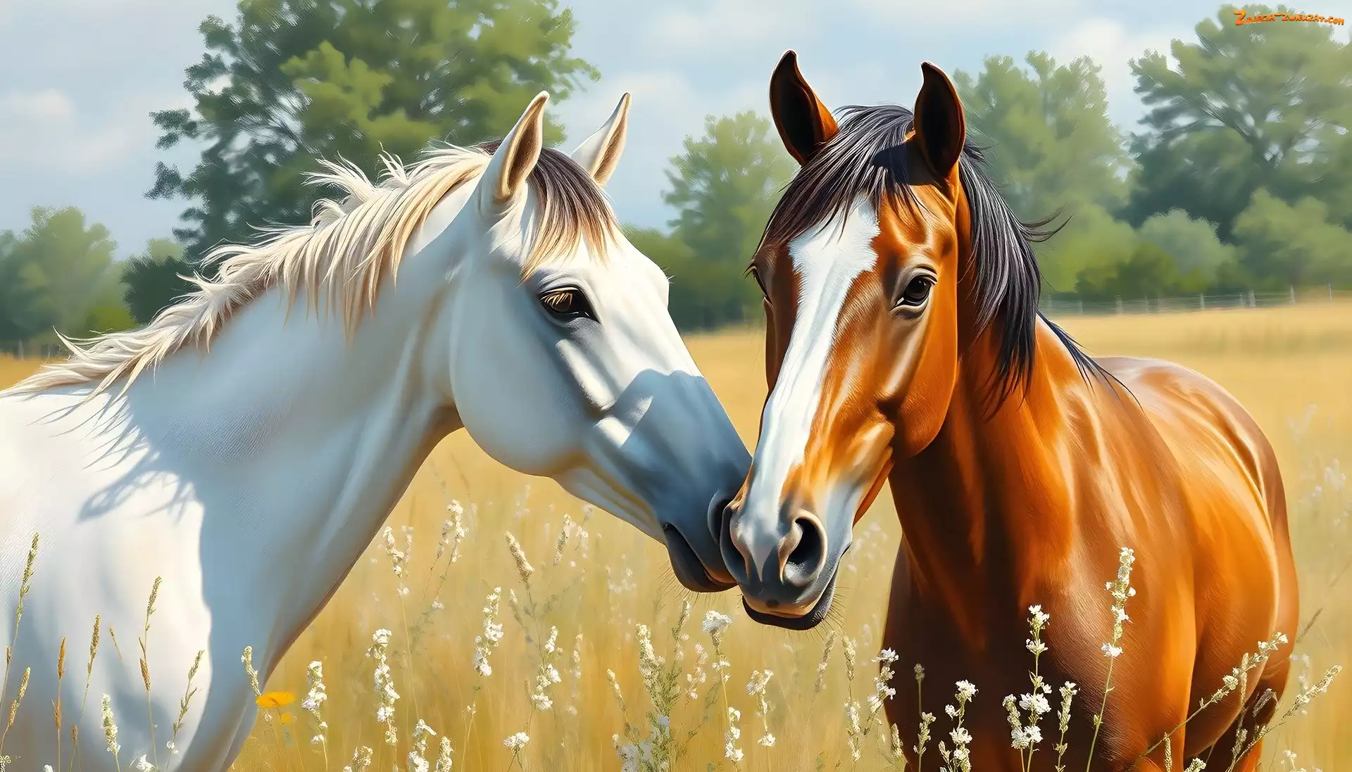 Zdjęcie: Grafika, Biały, Dwa, Konie, Brązowy, Łąka