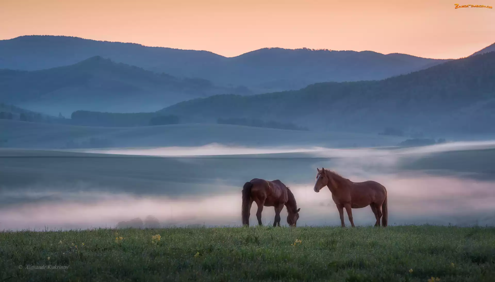 Zdjęcie: Konie, Łąka, Góry, Wschód słońca, Mgła