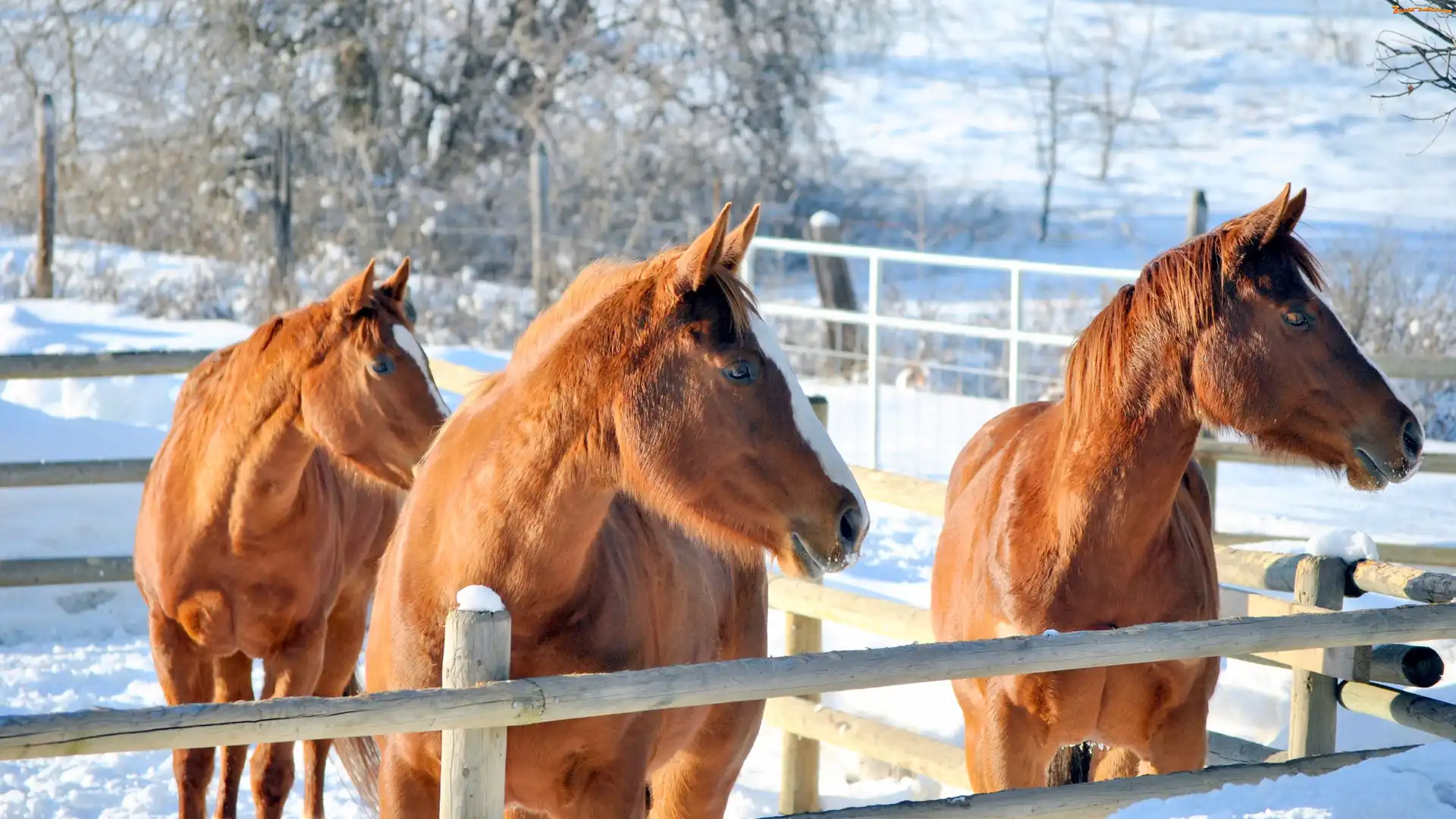 Konie, Drzewa, Zima, Zagroda