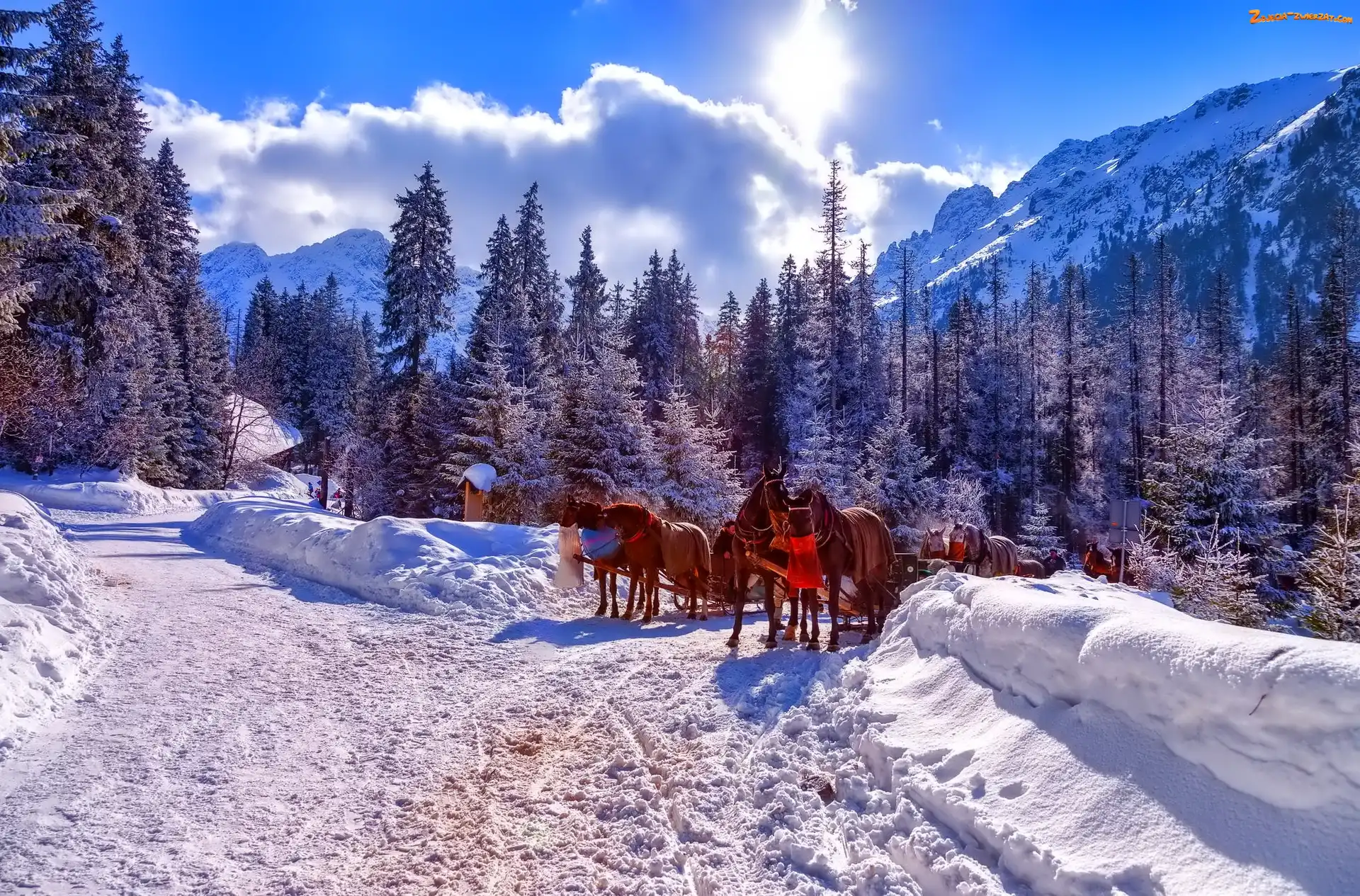Zdjęcie: Konie, Góry, Polska, Tatry, Zima, Zaprzęg