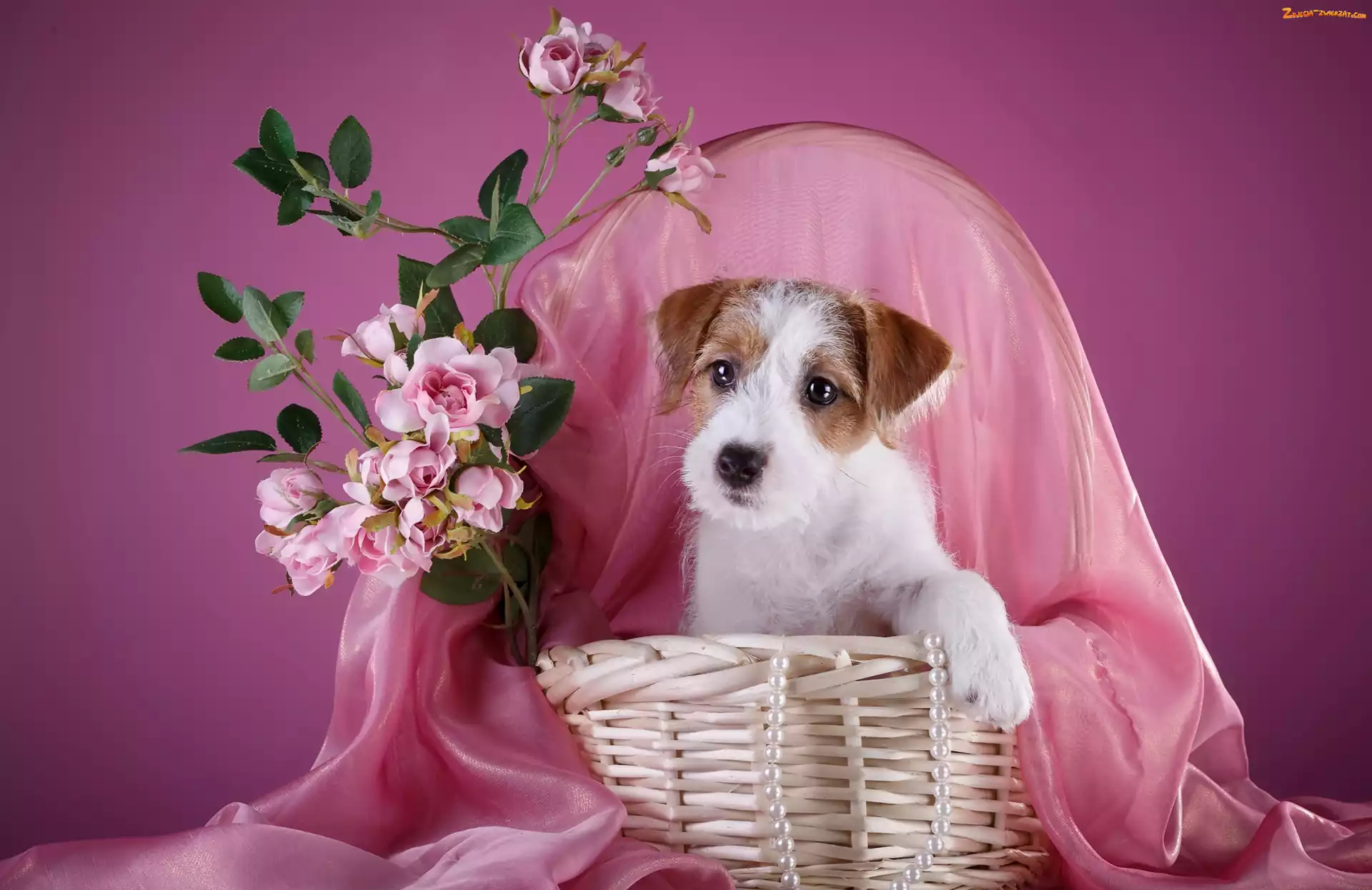 Kwiatki, Kosz, Szczeniak, Pies, Jack Russell terrier