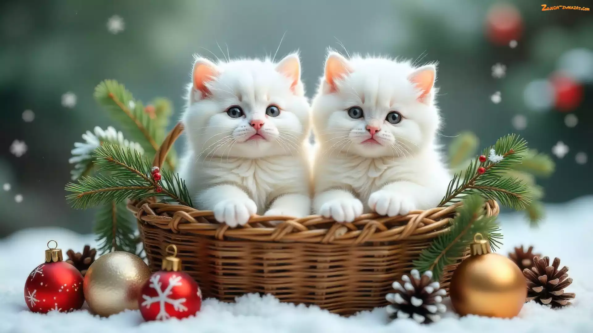 Zdjęcie: Bombki, Dwa, Białe, Koszyk, AI, Koty, Gałązki