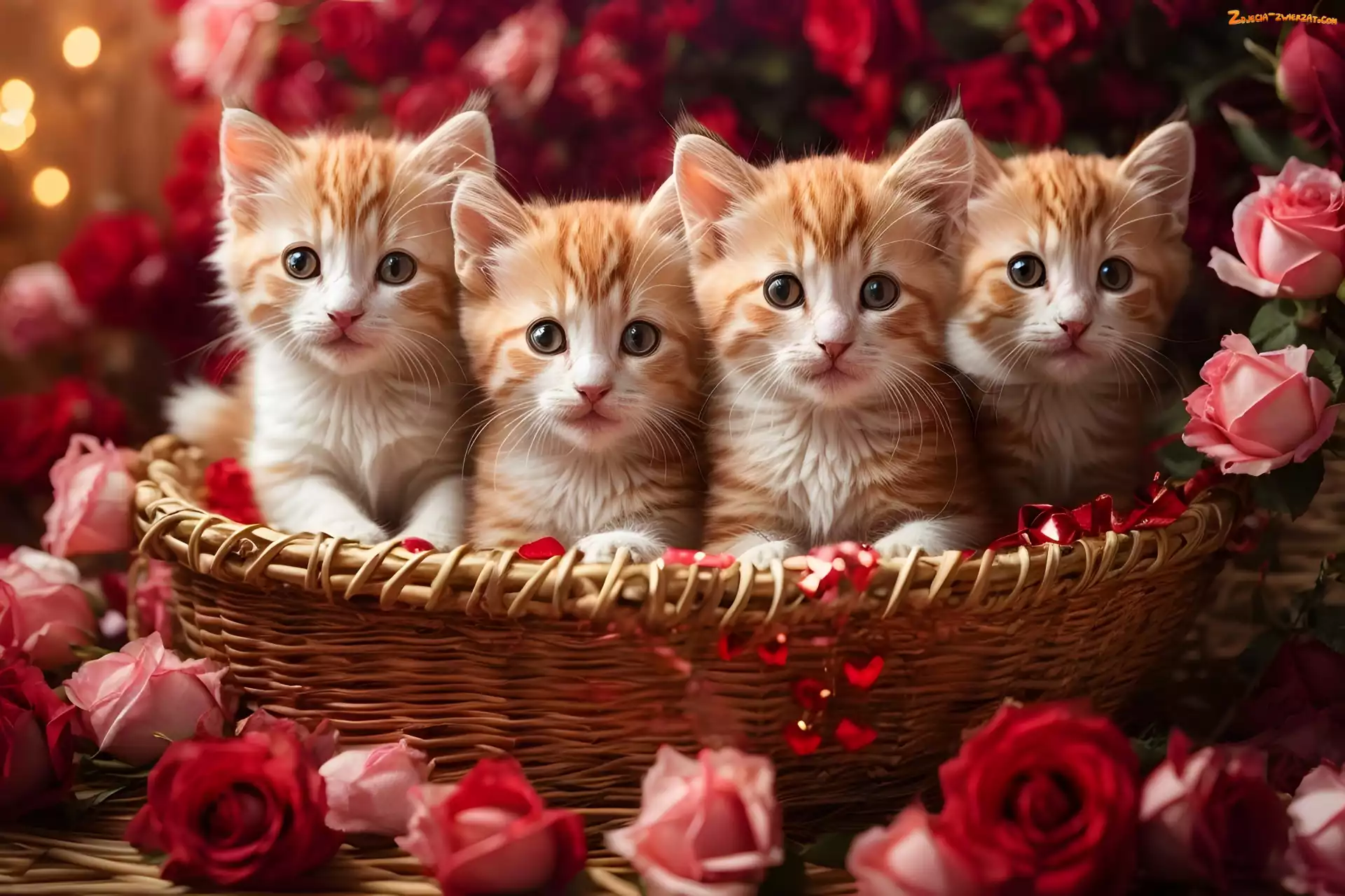 Zdjęcie: Kwiaty, Cztery, Kocięta, Koszyk, Grafika, Koty, Róże