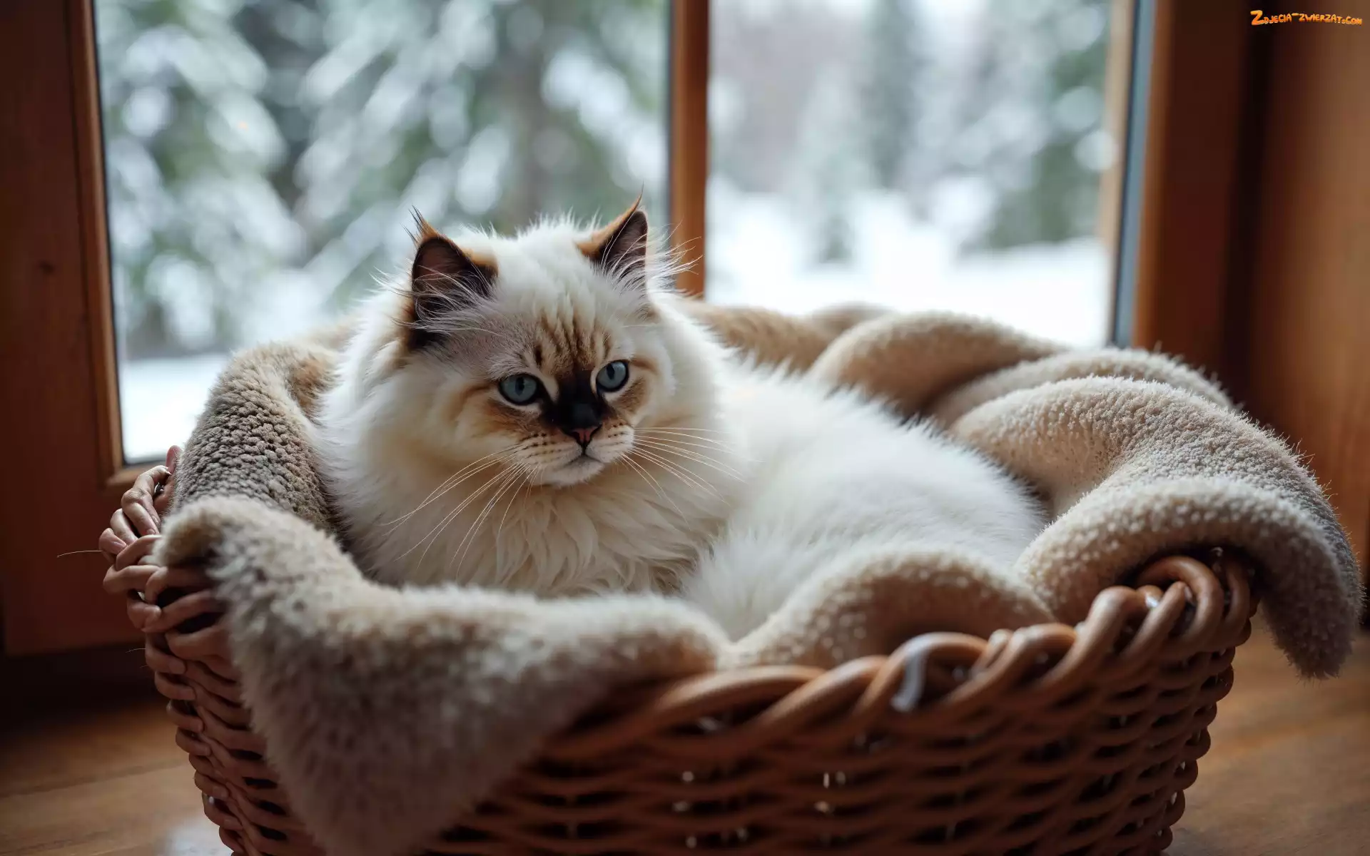Zdjęcie: Kocyk, Koszyk, Okno, Zima, Kot