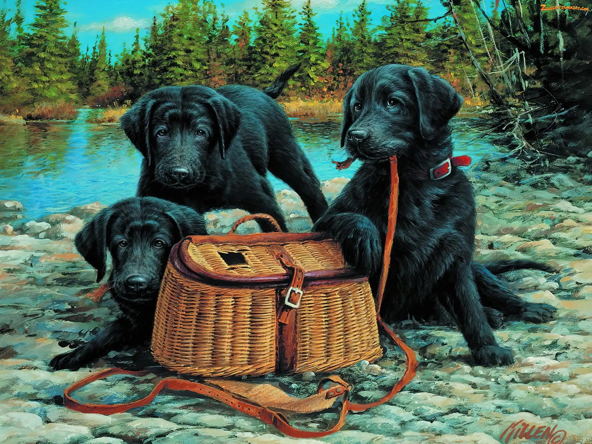 Zdjęcie: Koszyk, Szczeniaki, Czarne, Trzy, Psy