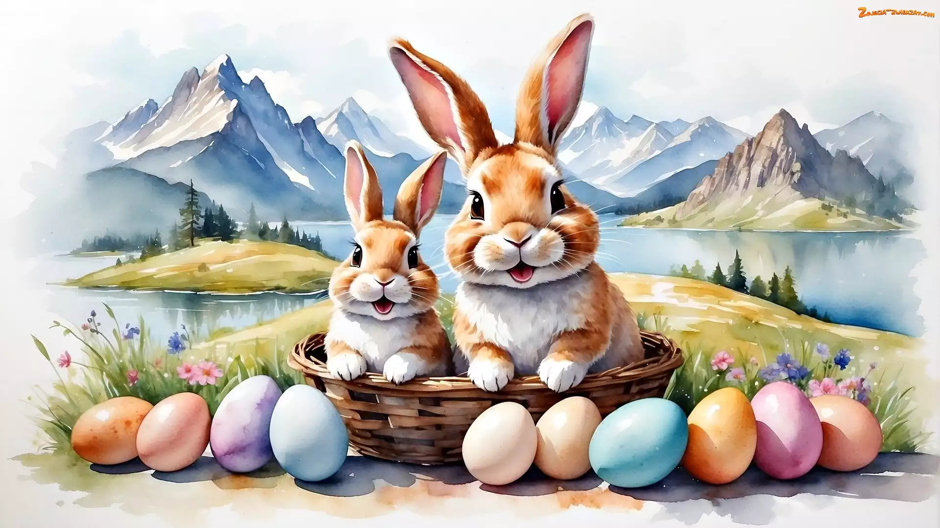Zdjęcie: Jezioro, Wielkanoc, Zające, Koszyk, Grafika, Pisanki, Góry