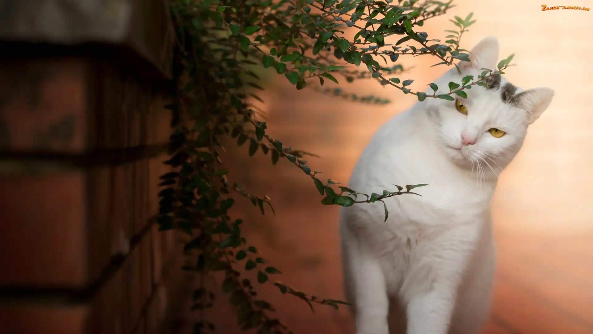 Zdjęcie: Kot, Gałązki, Biały, Murek