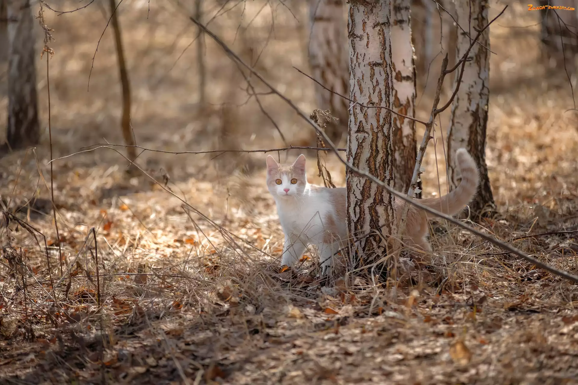 Zdjęcie: Kot, Brzozy, Rudo-biały, Drzewa