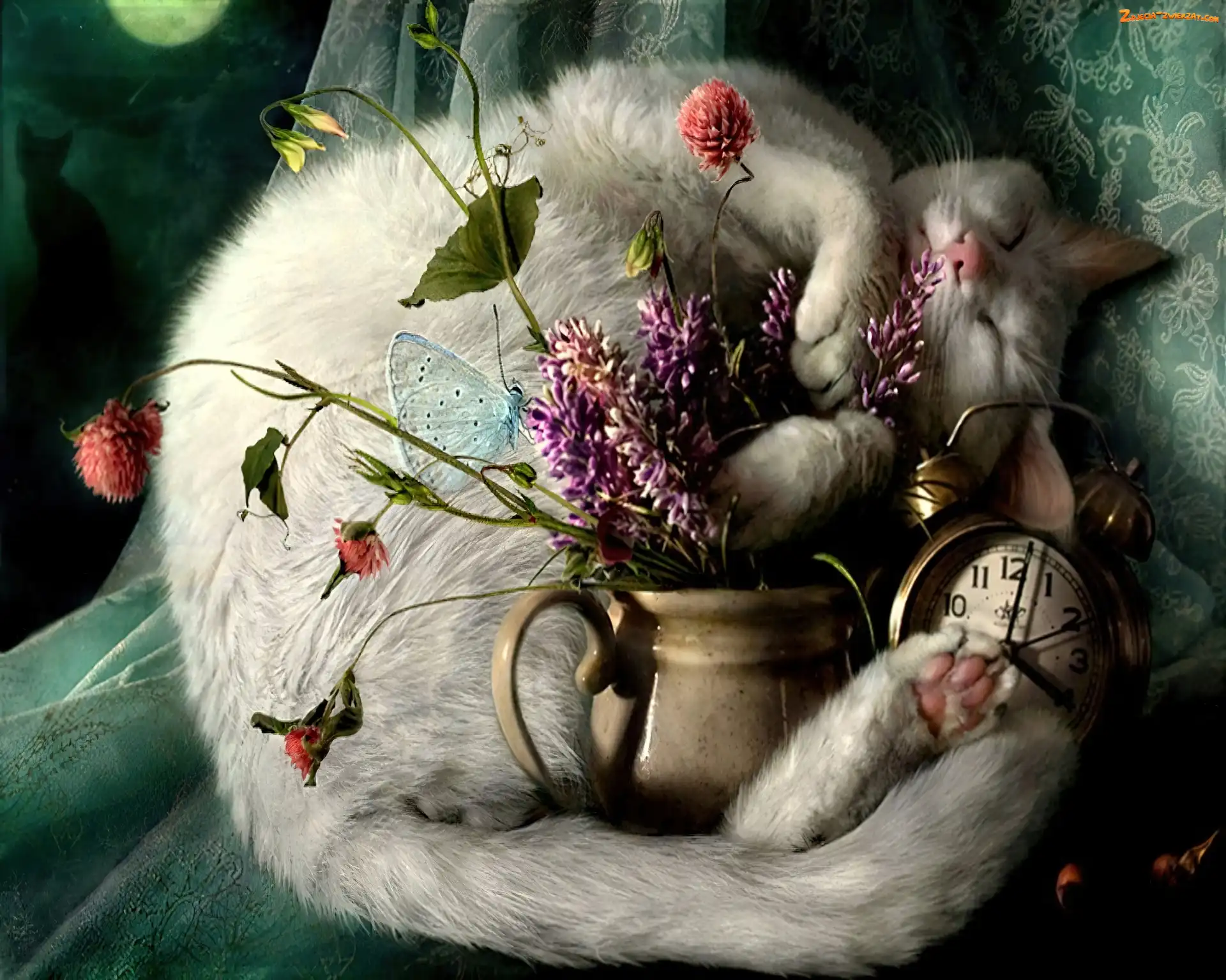 Zdjęcie: Kot, Zegar, Biały, Kwiaty