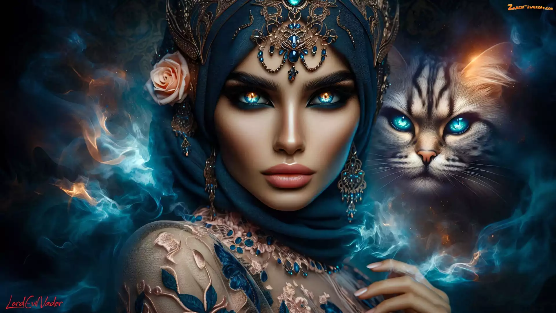 Zdjęcie: Niebieskie, Kobieta, Biżuteria, Kot, Grafika, Spojrzenie, Oczy