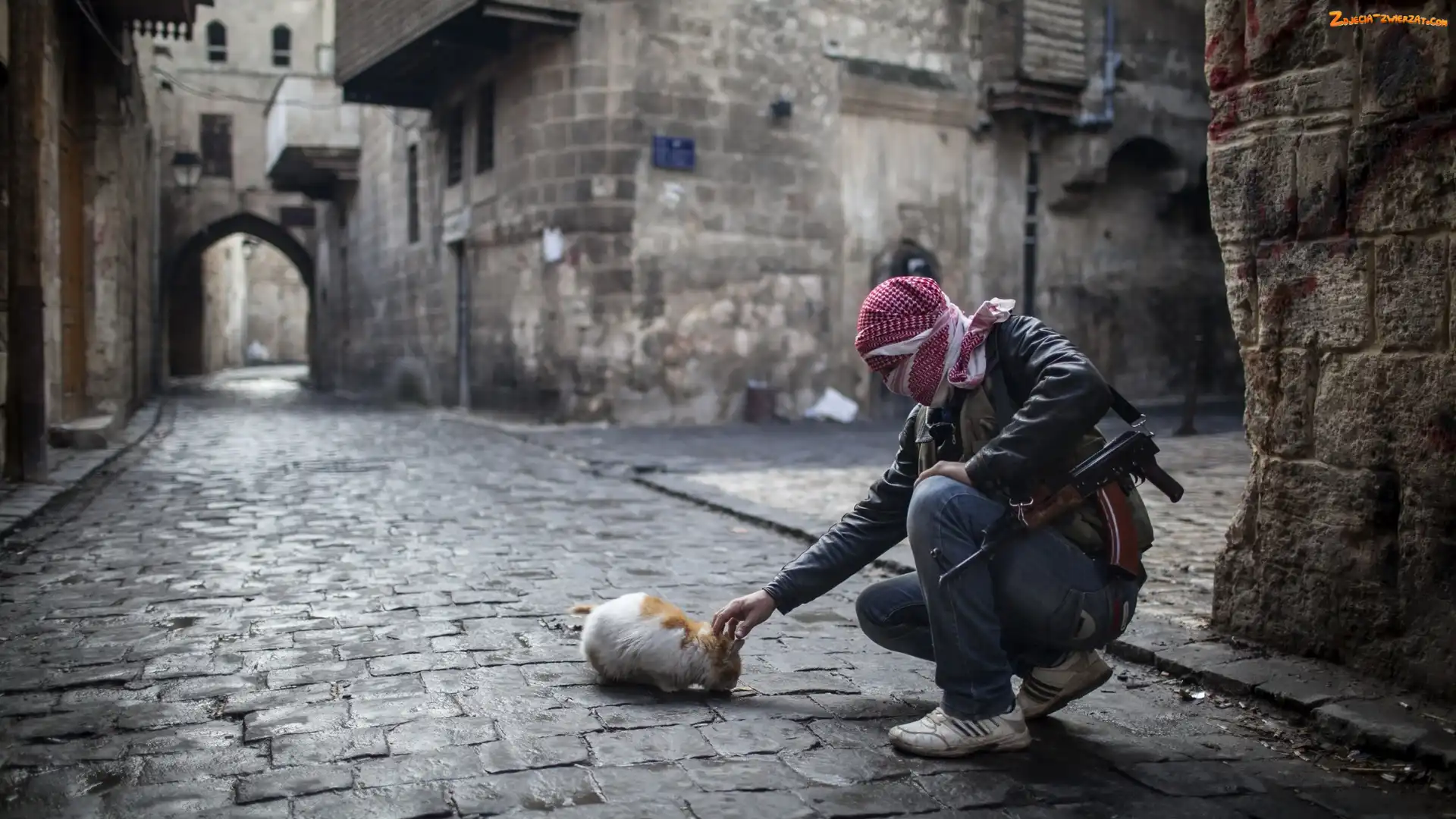 Zdjęcie: Kot, Karabin, Uliczka, Budynki, Mężczyzna
