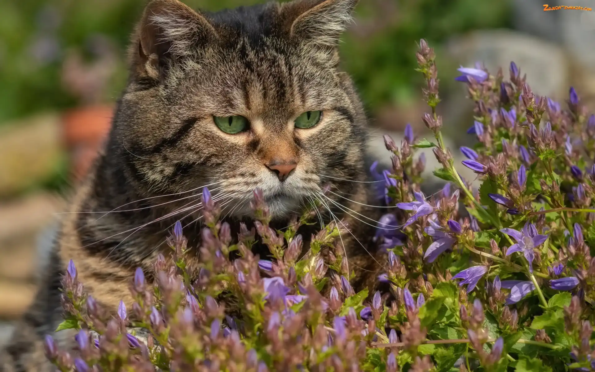 Zdjęcie: Kot, Kwiaty, Bury, Fioletowe