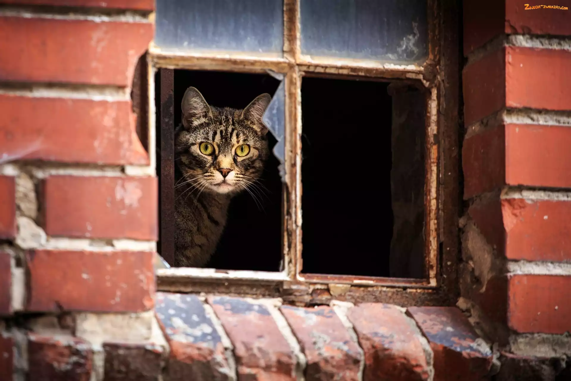 Zdjęcie: Kot, Okno, Bury, Wybite