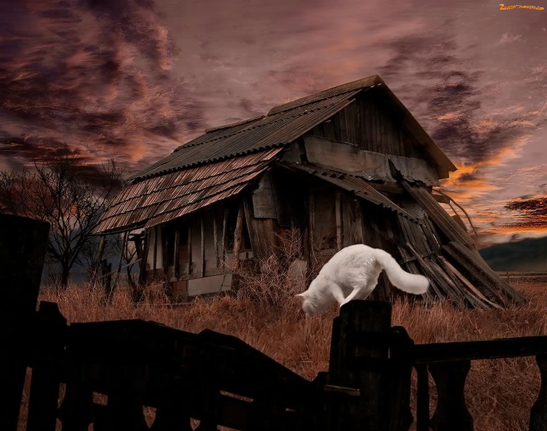 Zdjęcie: Kot, Płot, Dom, Chmury