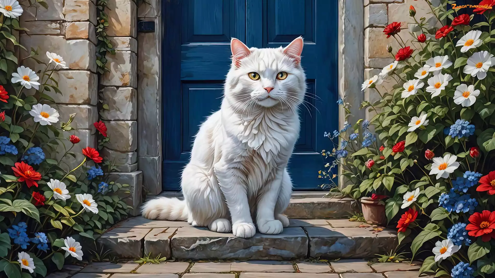 Zdjęcie: Grafika, Kwiaty, Biały, Kot, Niebieskie, Drzwi
