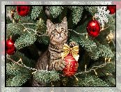 Boże Narodzenie, Gałązki, Kot, Świerkowe, Bombki, Światełka