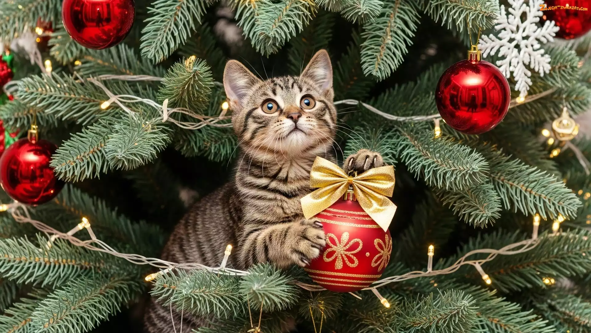 Zdjęcie: Boże Narodzenie, Gałązki, Kot, Świerkowe, Bombki, Światełka