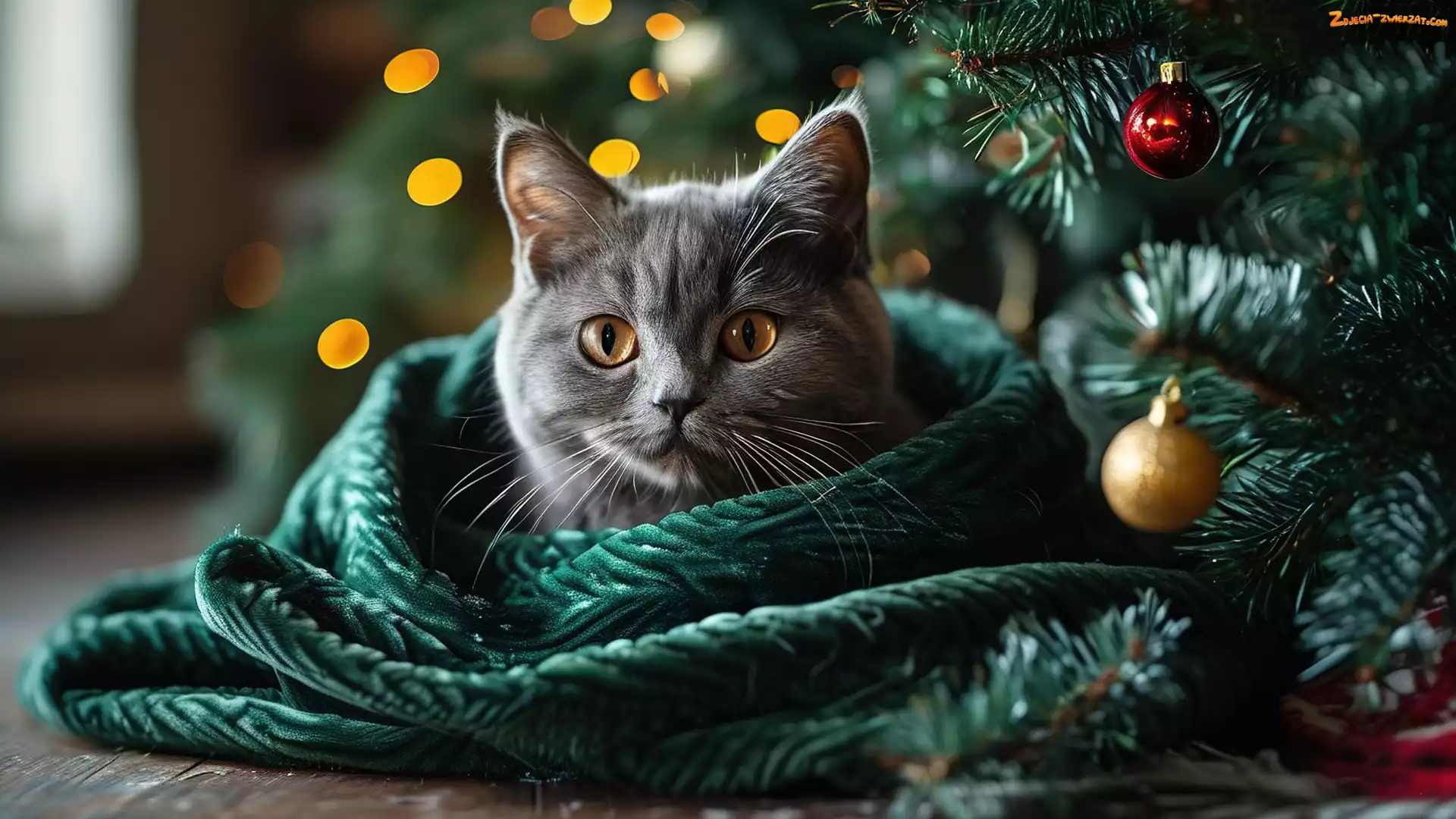 Zdjęcie: Bombki, Zielony, Szary, Kot, Koc, Gałązki
