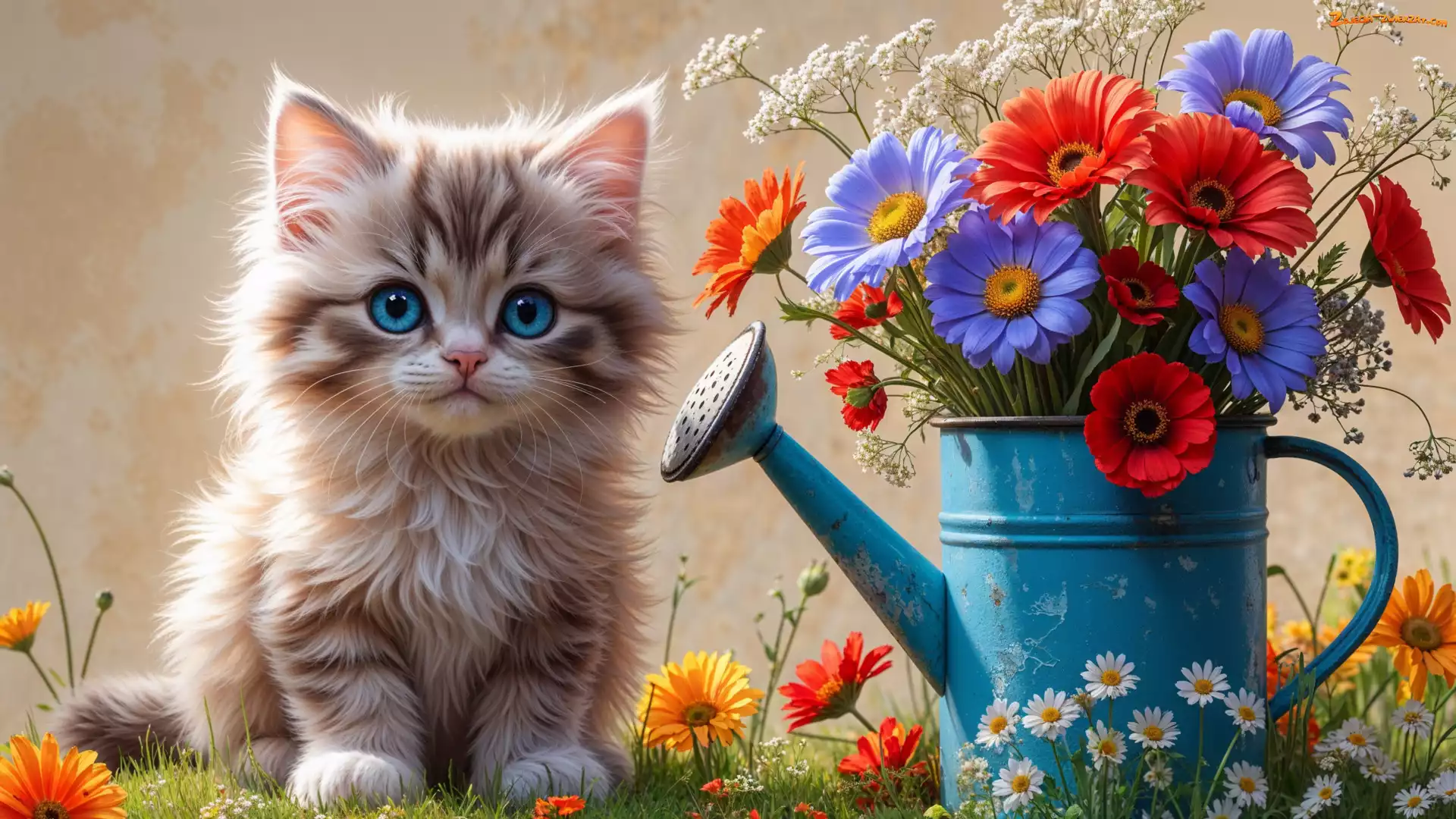 Zdjęcie: Konewka, Oczy, Kolorowe, Mały, Kwiaty, Puszysty, Niebieskie, Kot