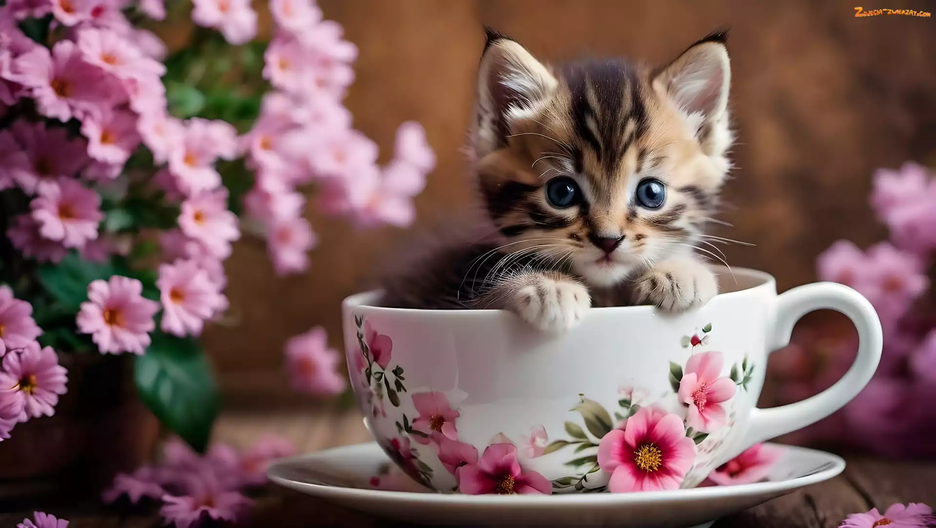 Zdjęcie: Grafika, Kociak, Bury, Kot, Filiżanka, Kwiaty