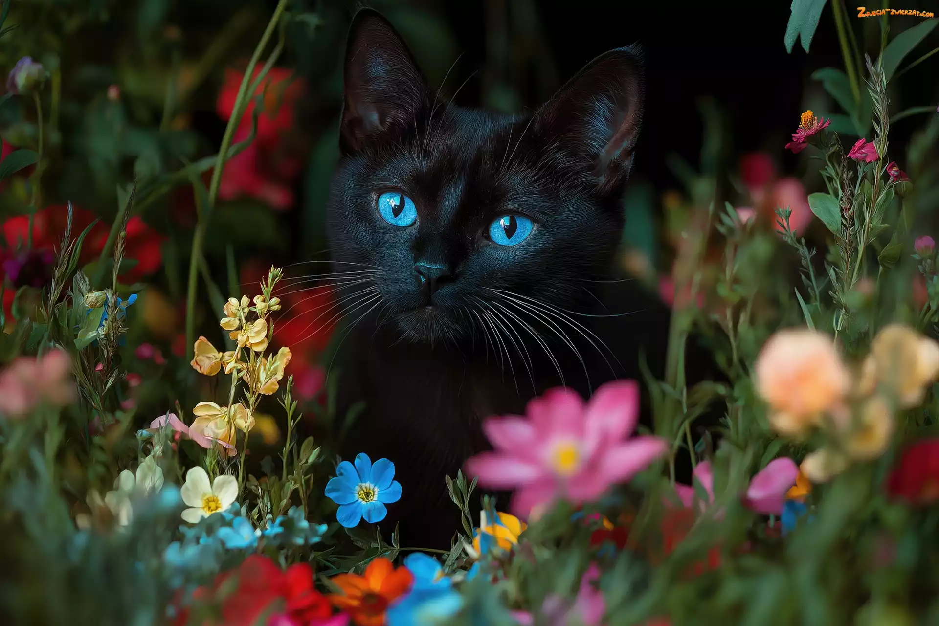 Zdjęcie: Grafika, Niebieskie, Czarny, Kot, Oczy, Kwiaty
