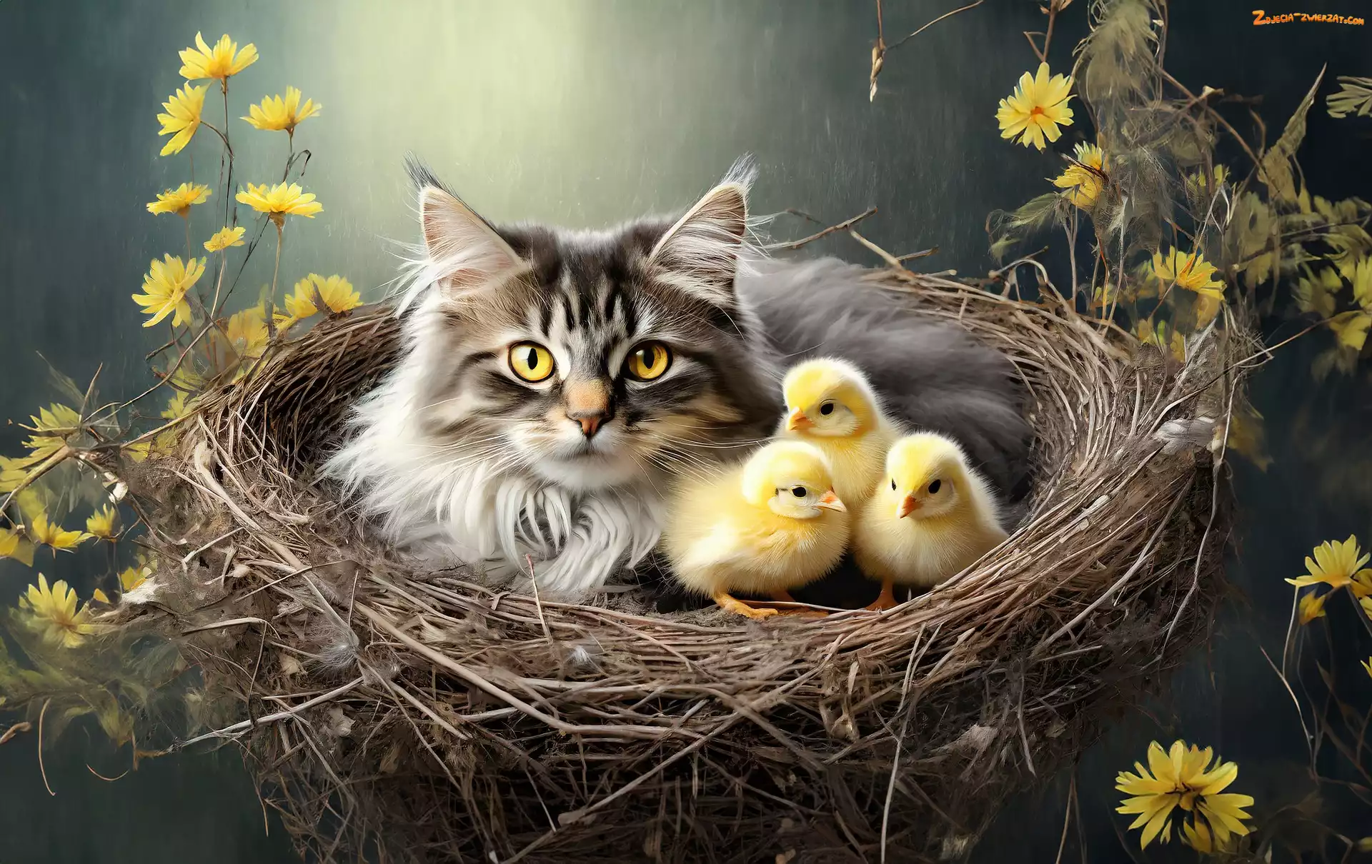 Zdjęcie: Kurczaki, Kot, Kwiaty, Wielkanoc, Gniazdko