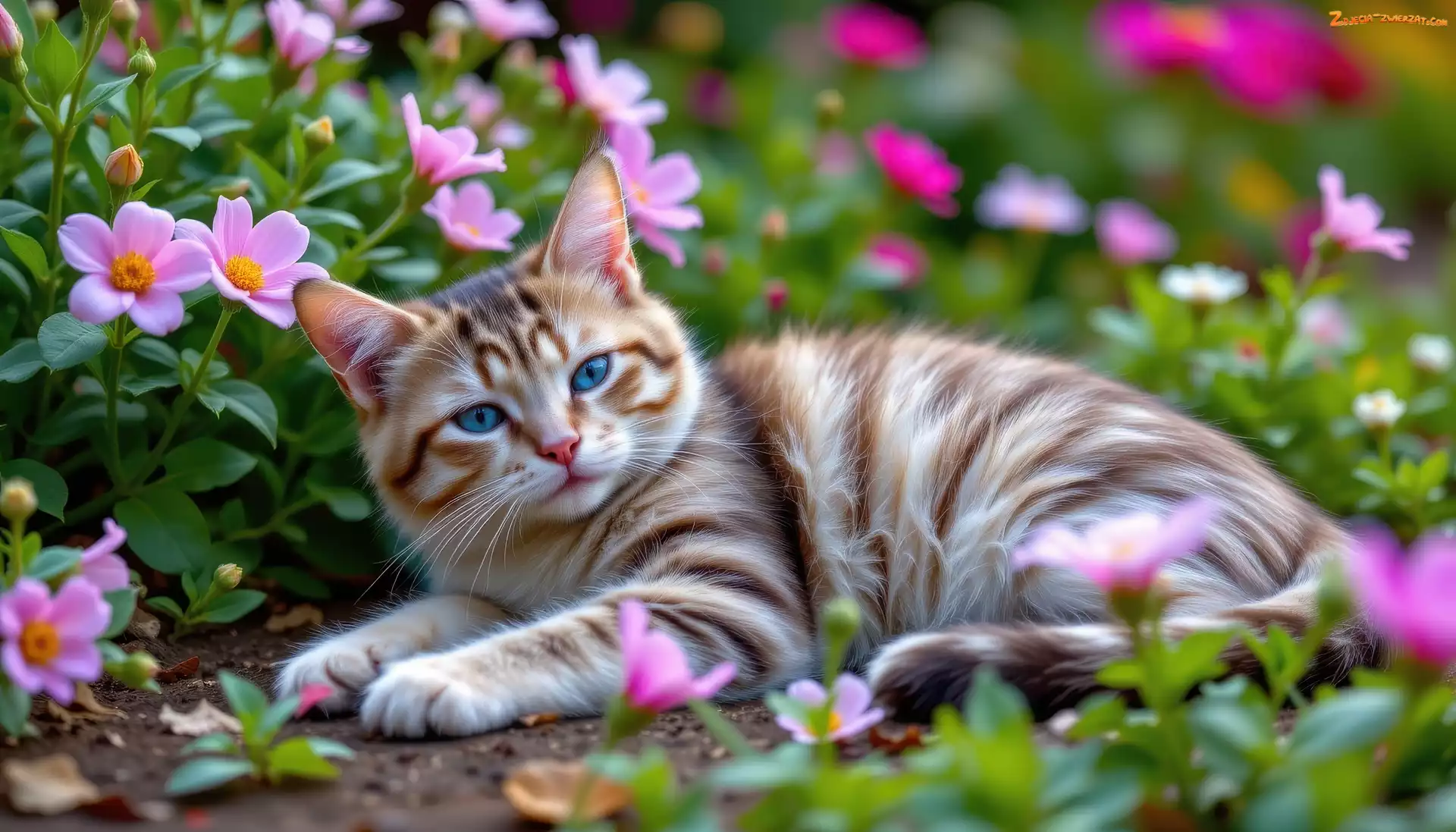 Zdjęcie: Leżący, Pręgowany, Kwiaty, Kot