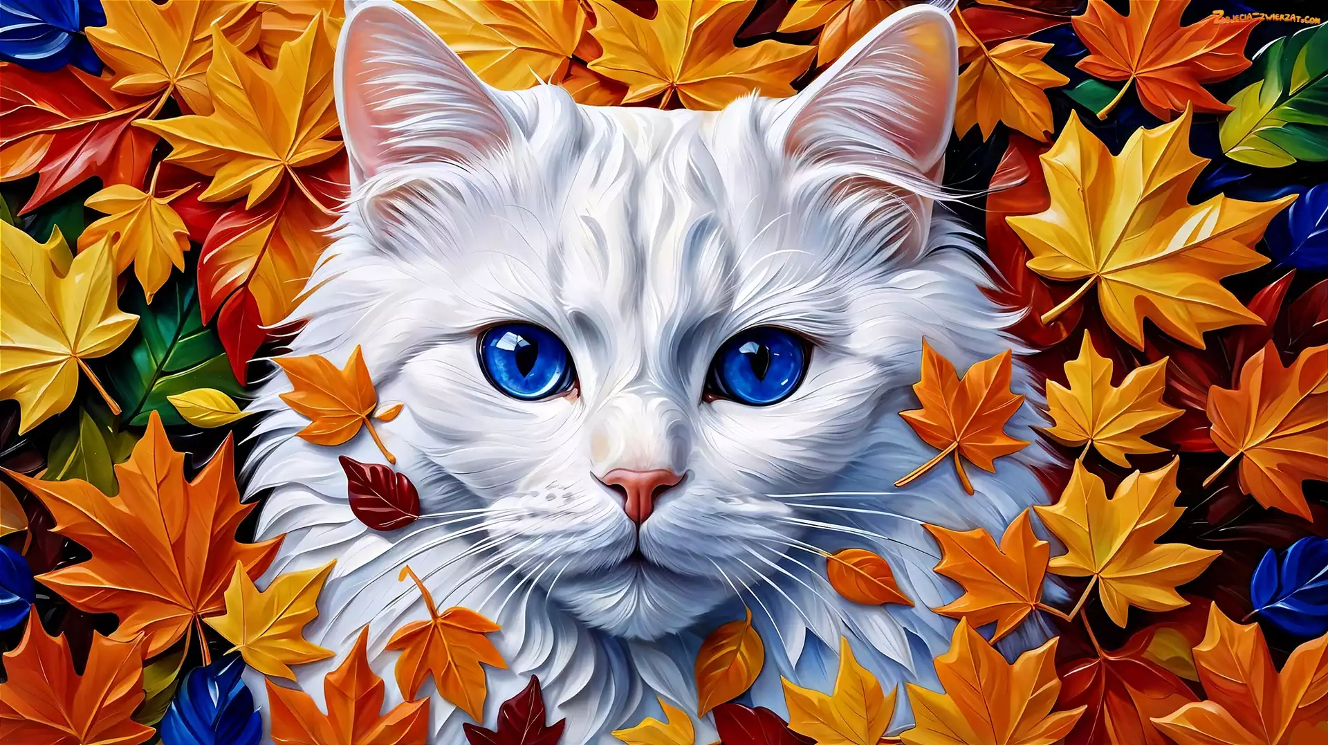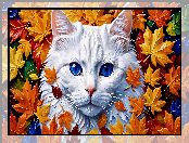 Zdjęcie: Grafika AI, Niebieskie, Kot, Biały, Oczy, Liście