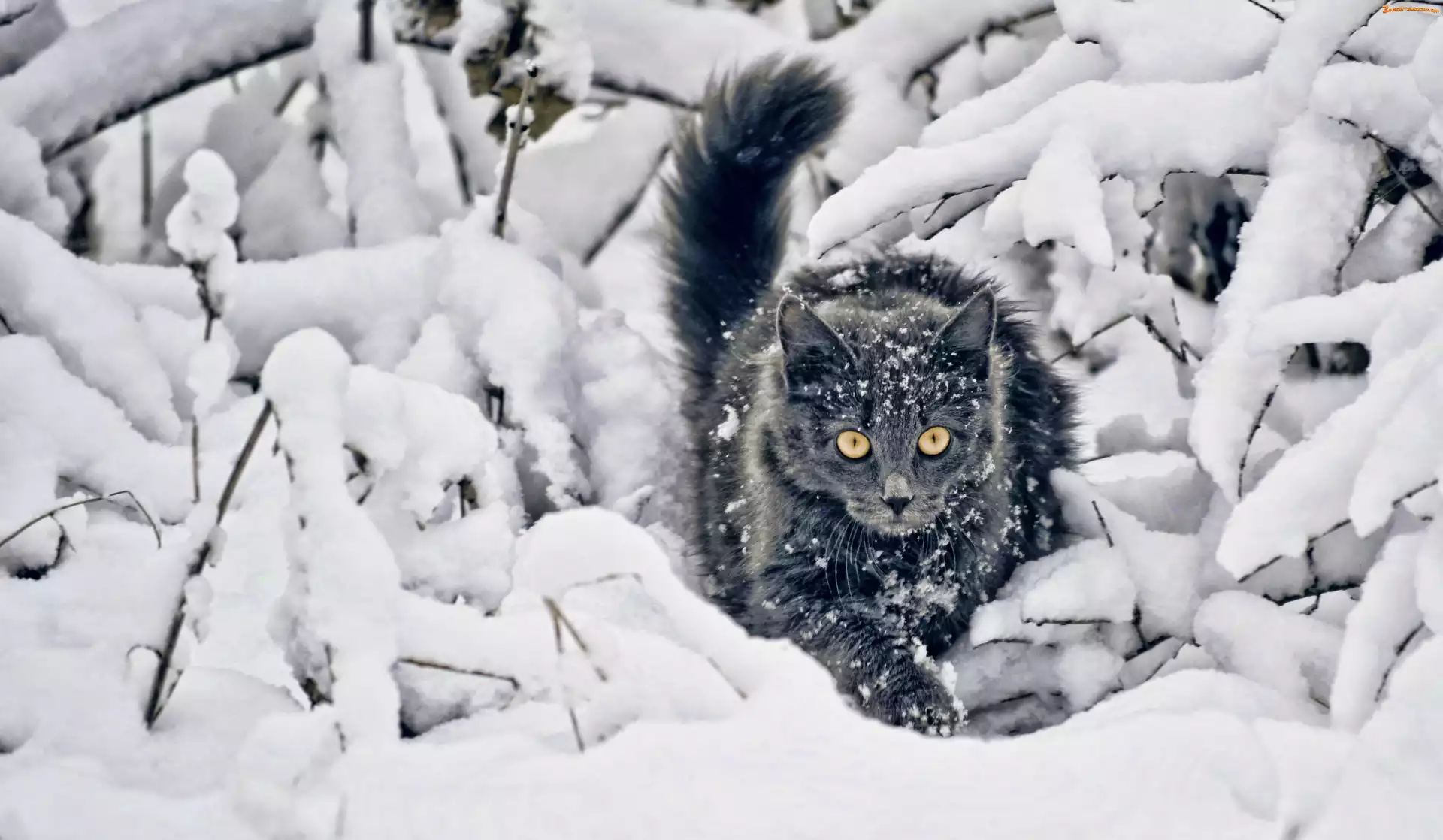Zdjęcie: Śnieg, Kot, Gałązki