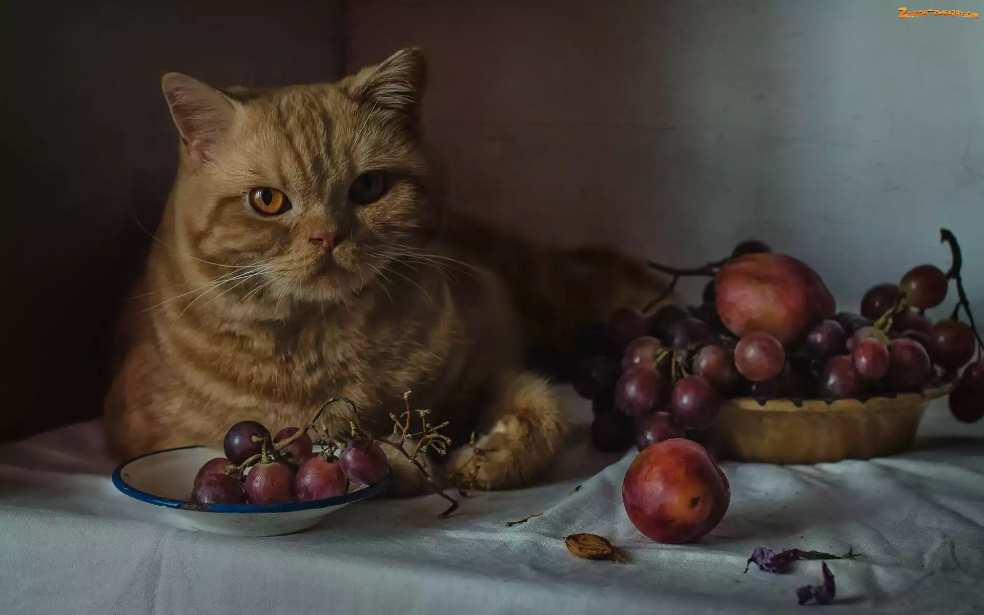 Zdjęcie: Kot, Stół, Śliwki, Winogrona, Obrus, Owoce