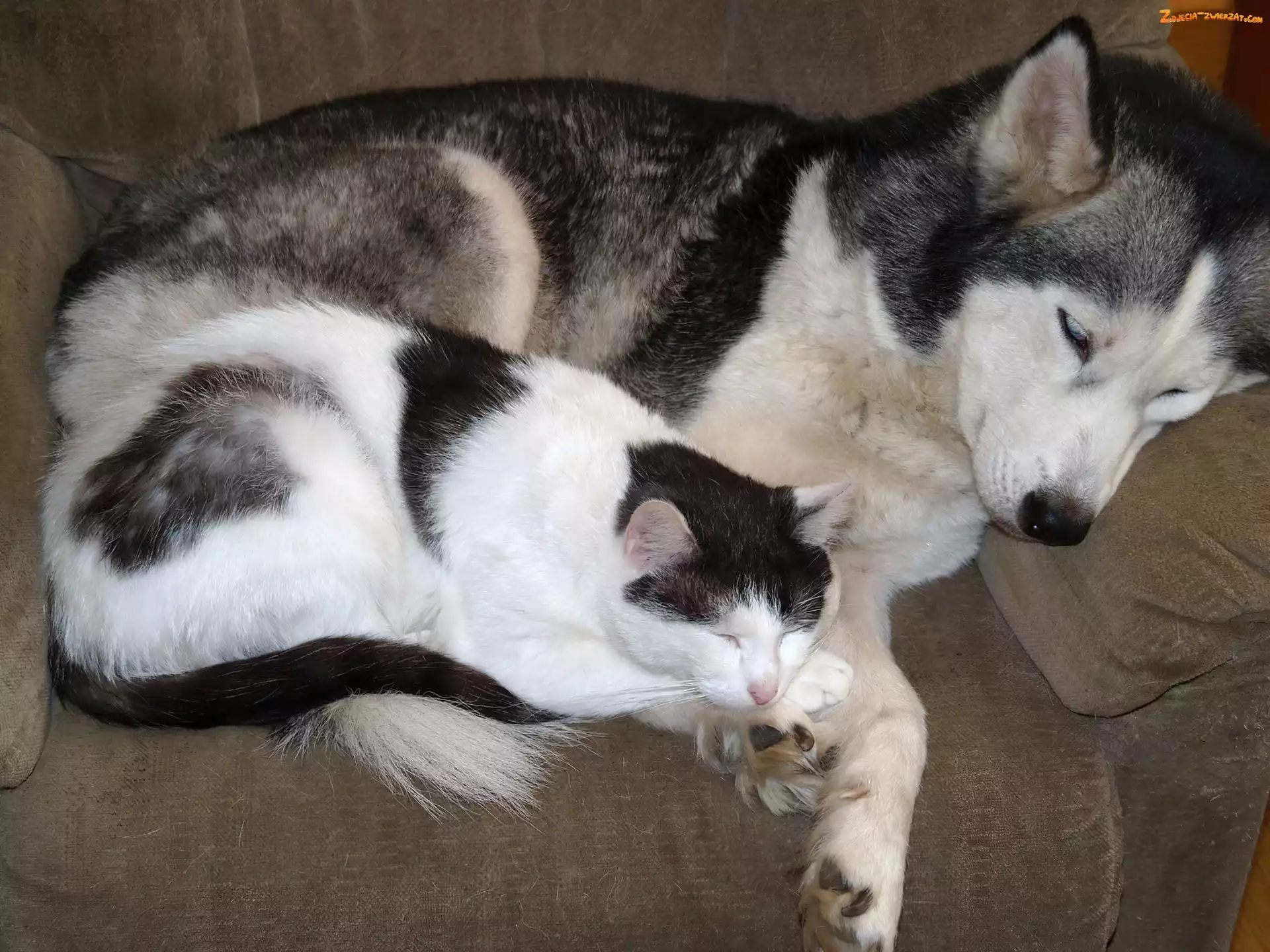 Zdjęcie: Kot, Siberian Husky, Śpiący, Pies