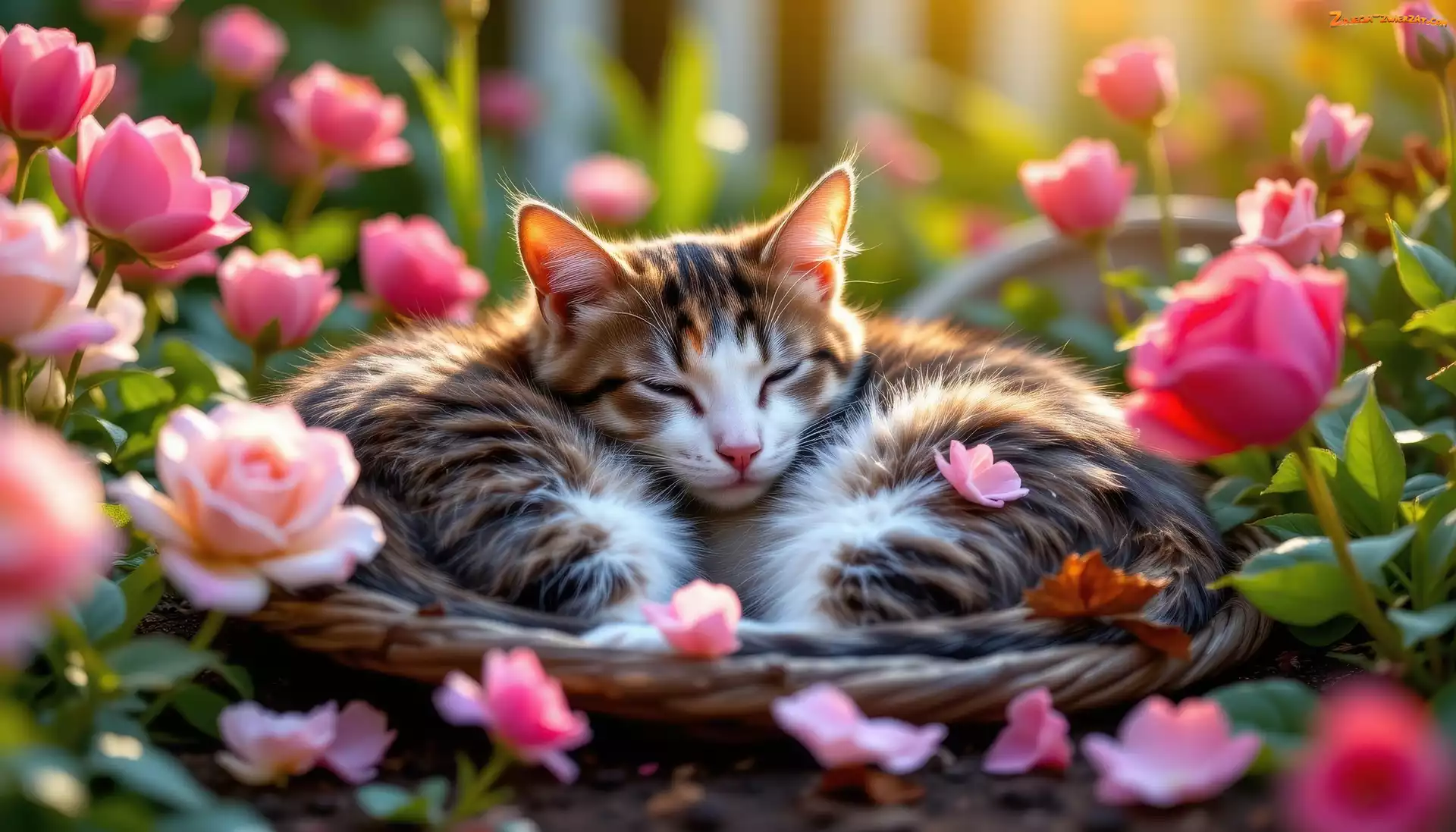 Zdjęcie: AI, Sen, Ogród, Kot, Kwiaty, Róże