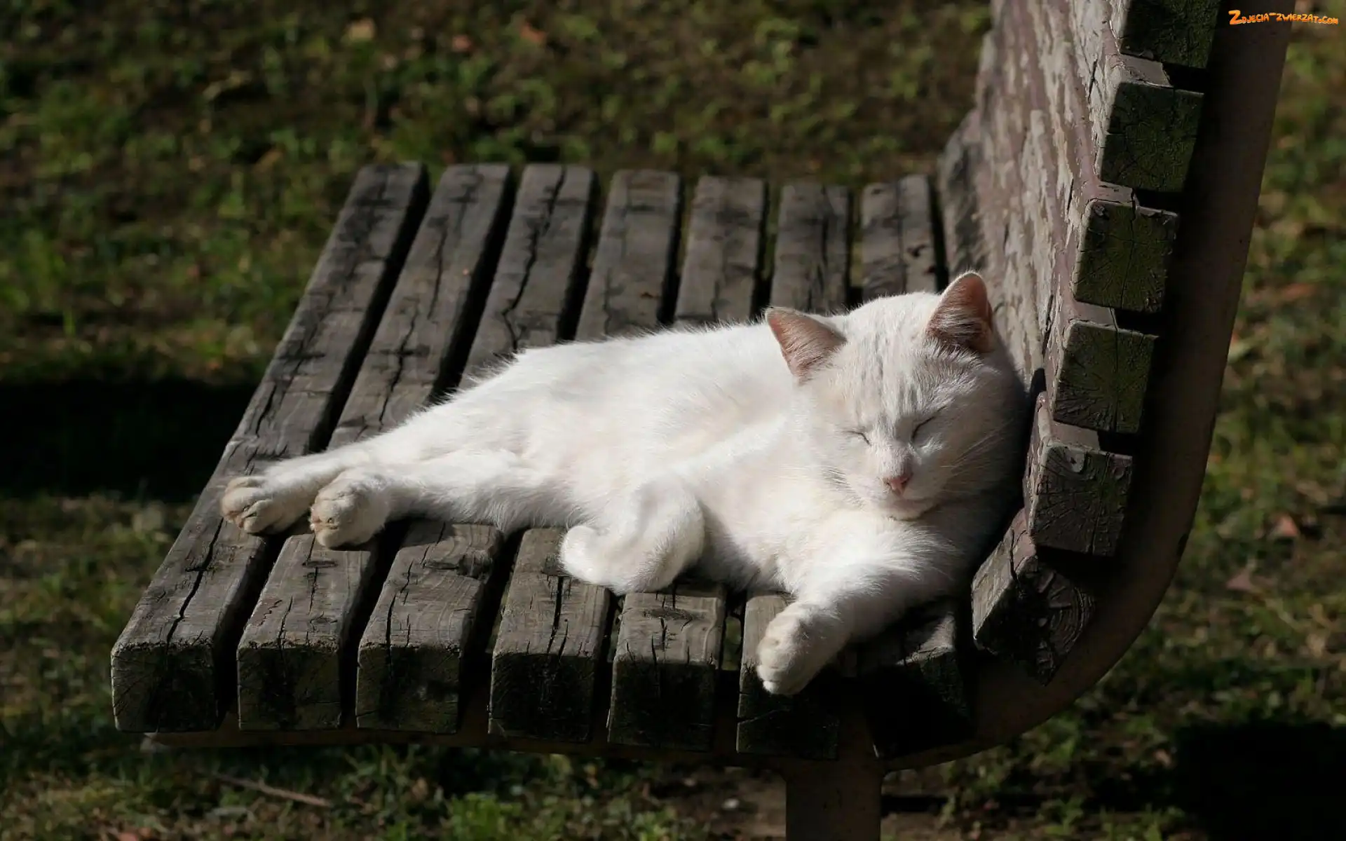 Zdjęcie: Kot, Biały, Ławka, Trawa, Śpiący