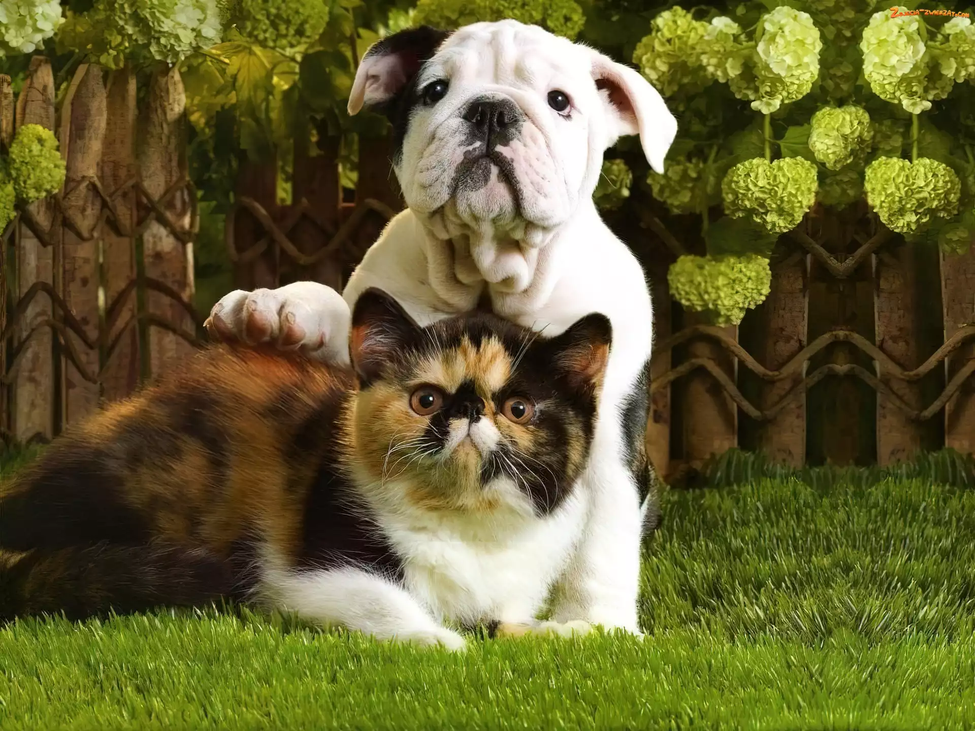 Zdjęcie: Kot, Pies, Buldog, Trawa