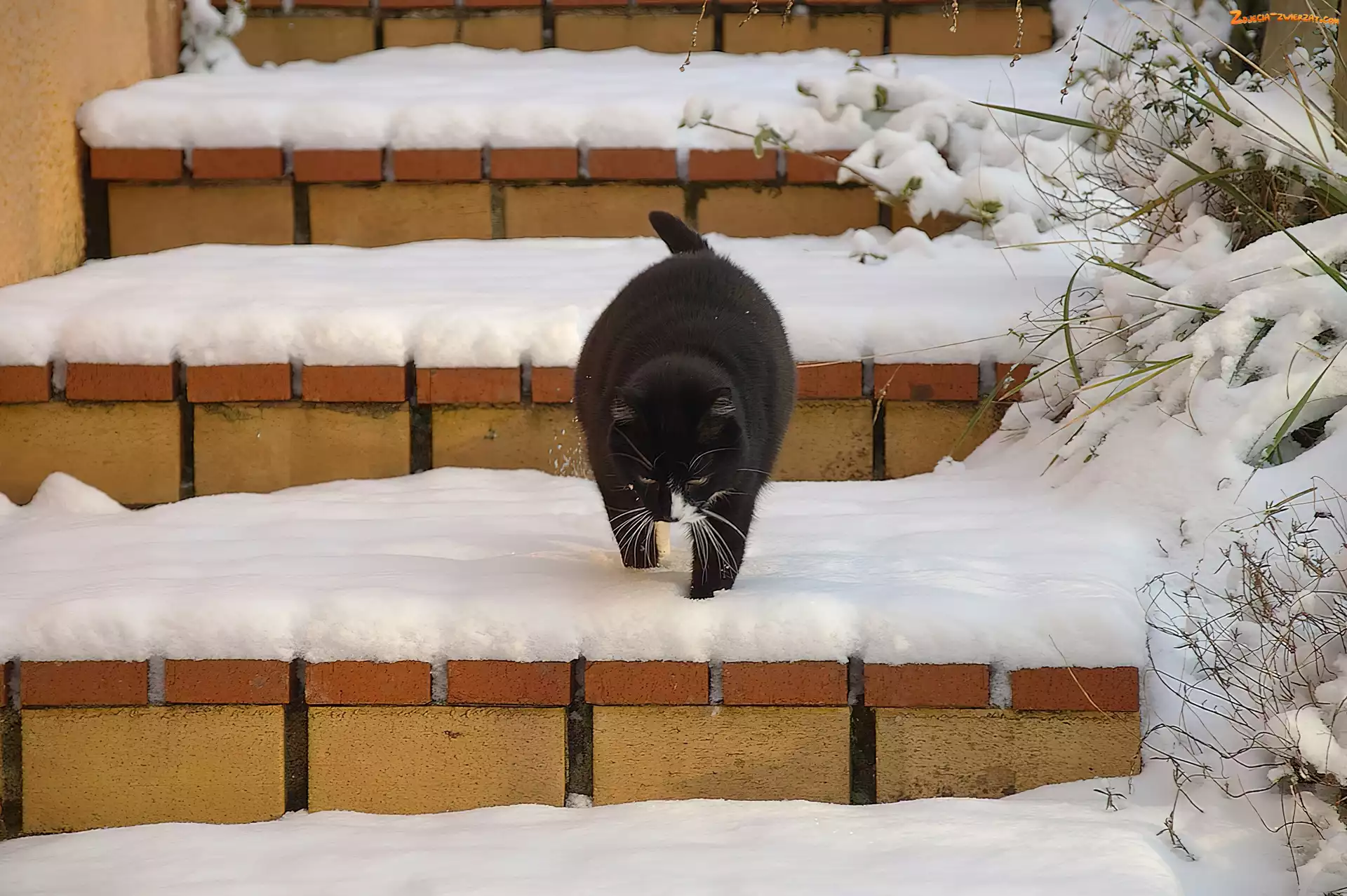 Zdjęcie: Czarny, Kotek, Zima, Schody