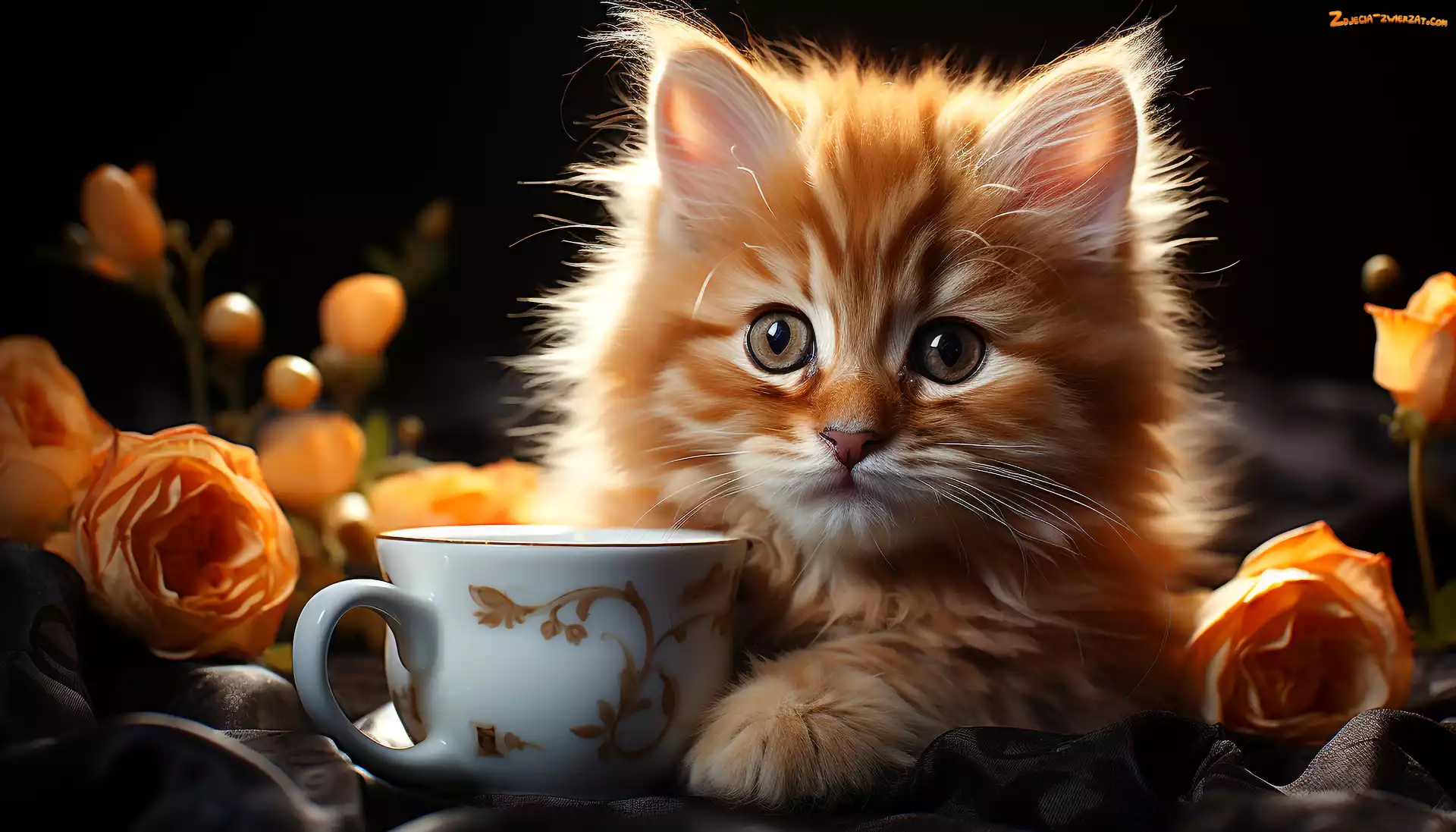 Zdjęcie: Filiżanka, Kotek, Róże, Mały, Rudy