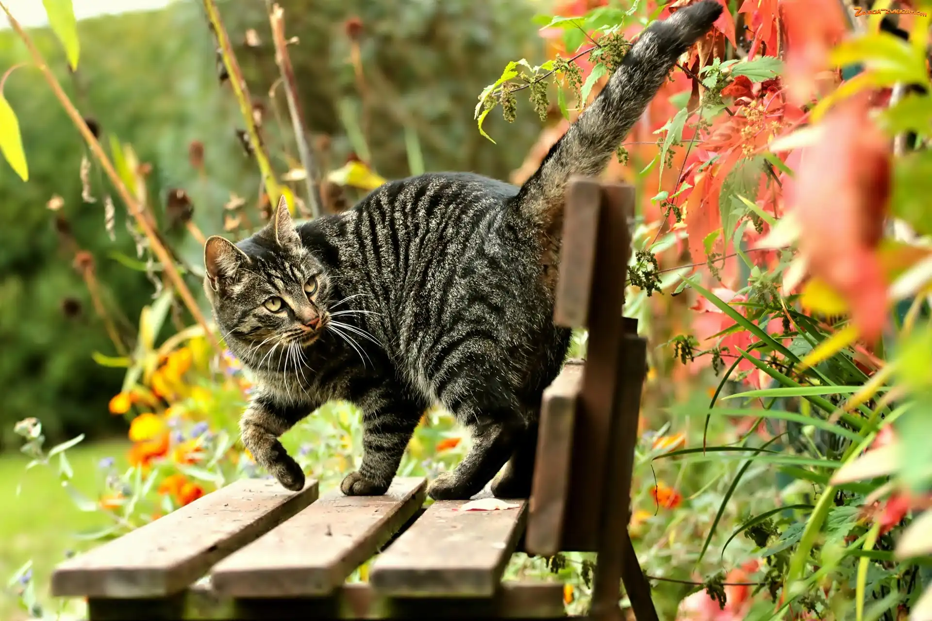 Zdjęcie: Kotek, Kwiatki, Szary, Ławka