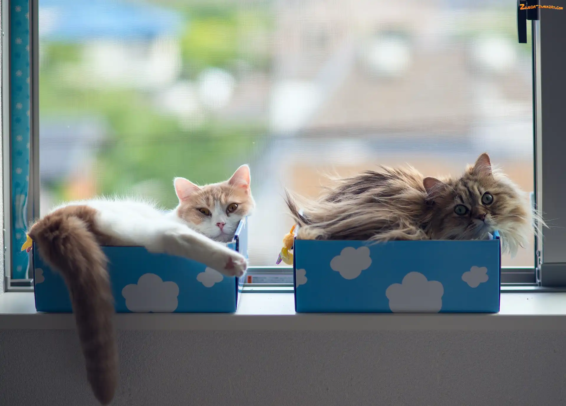 Zdjęcie: Okno, Kotki, Pudełka
