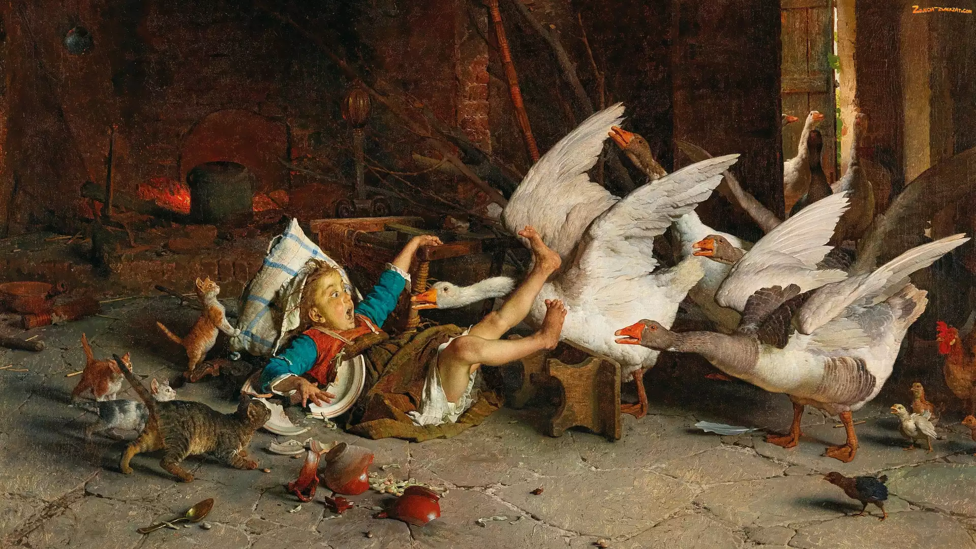 Zdjęcie: Dzbanek, Gaetano Chierici, Gęsi, Przewrócona, Malarstwo, Stodoła, Rozbity, Dziewczynka, Kotki |