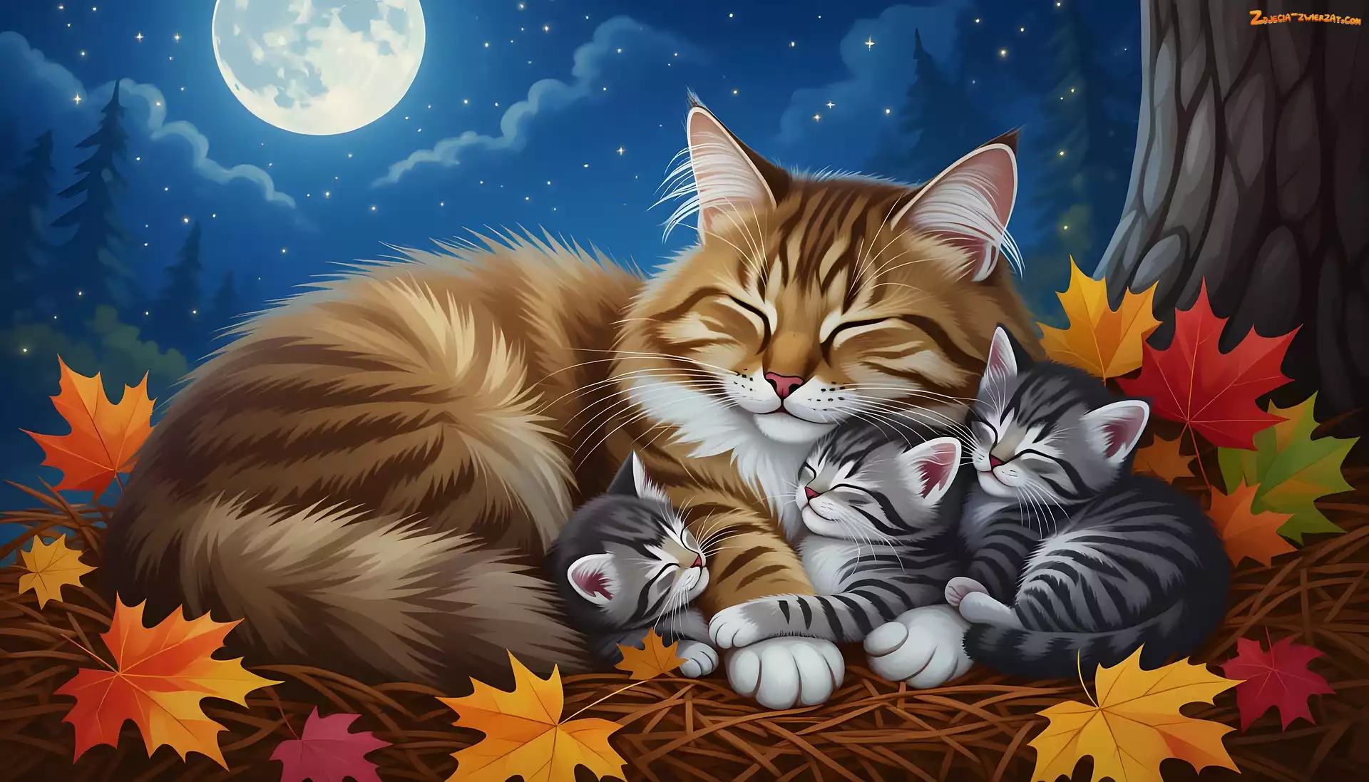 Zdjęcie: Liście, Koty, Trzy, Kotki, 2D, Małe, Noc