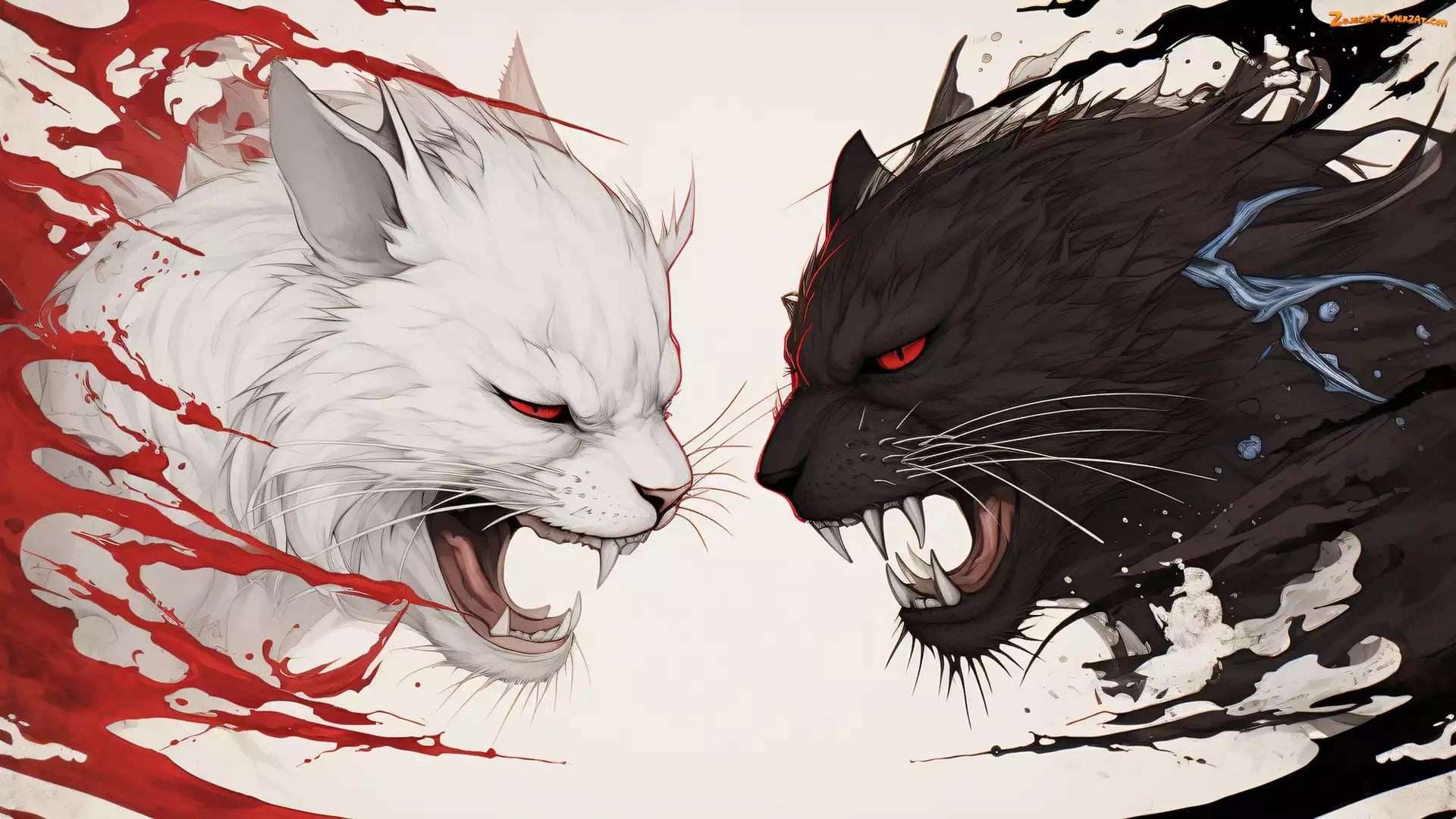 Zdjęcie: Czarny, Grafika, Dwa, Koty, Kły, Złe, Biały