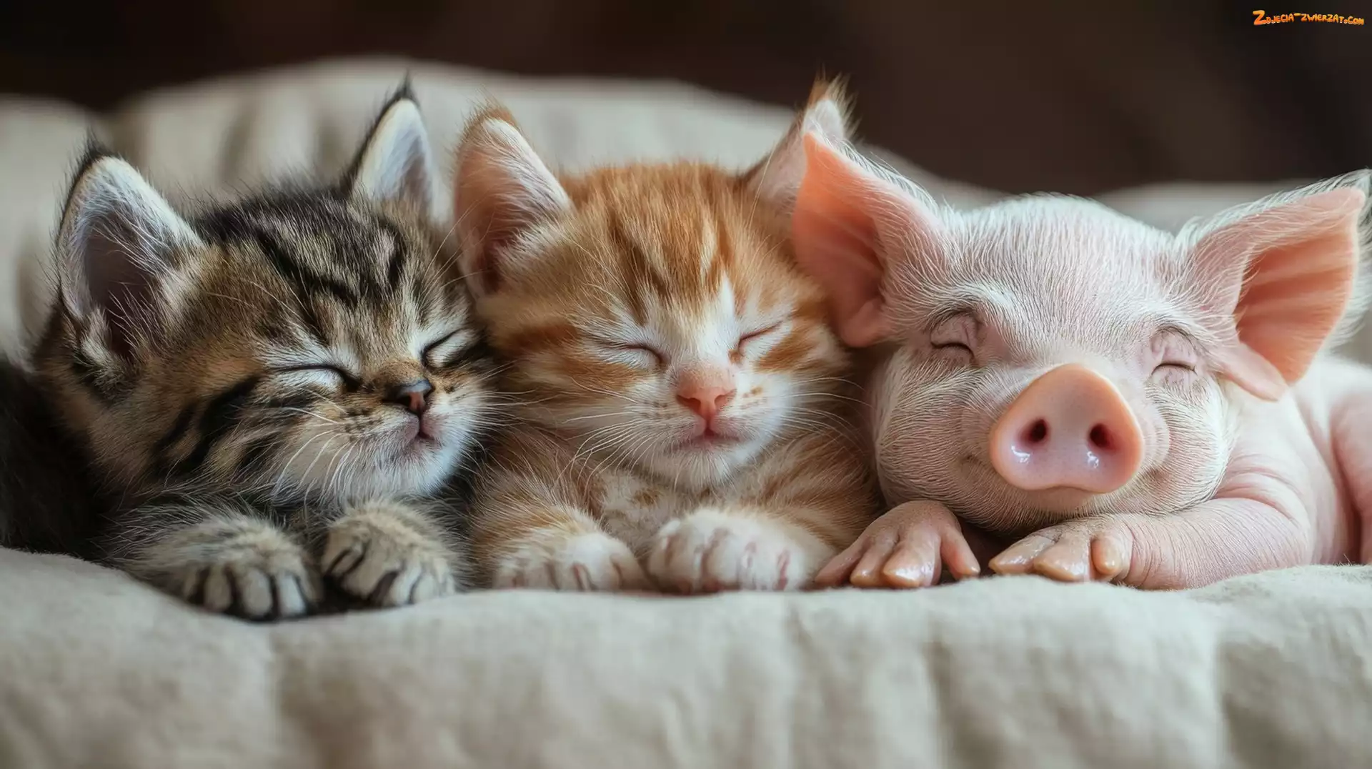 Zdjęcie: Kotki, Śpiące, Dwa, Koty, Świnka, Małe, Prosiaczek