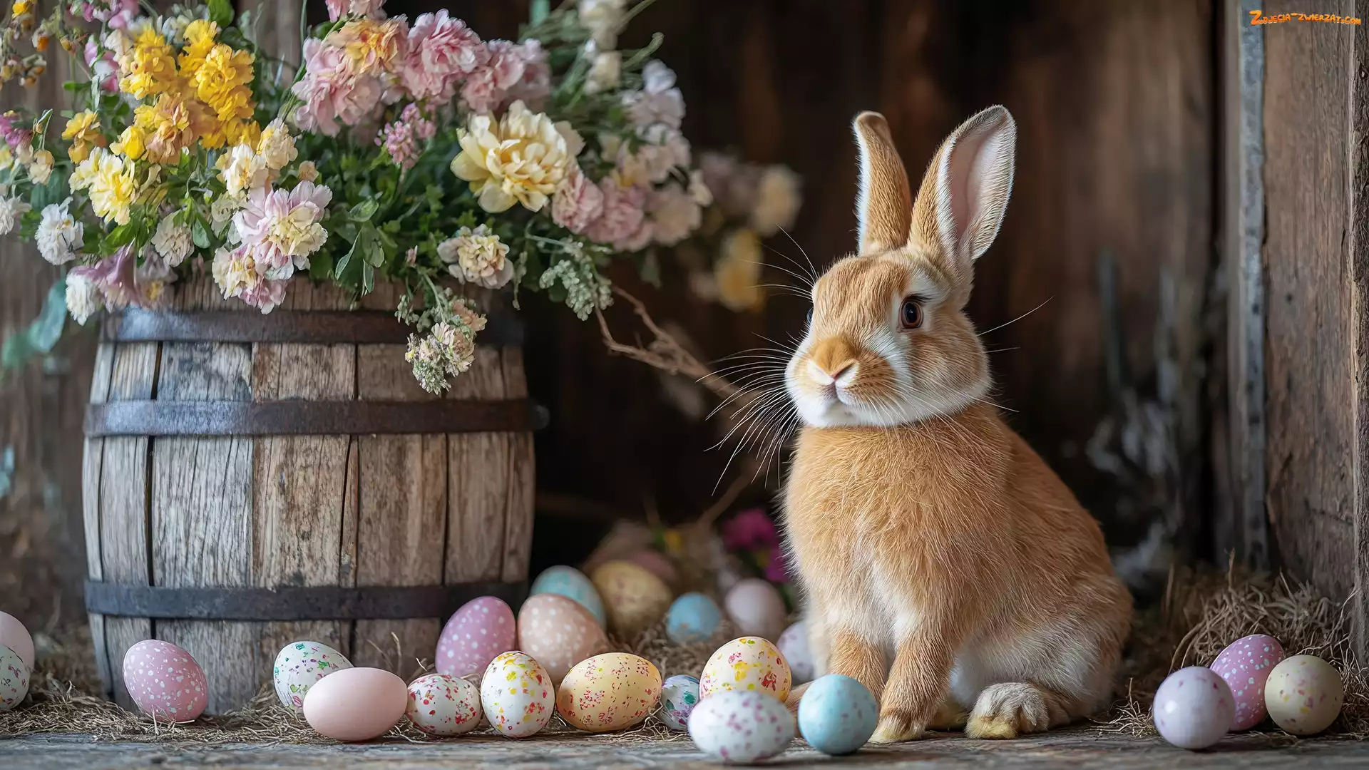 Kwiaty, Kolorowe, Wielkanoc, Królik, Pisanki, Beczka