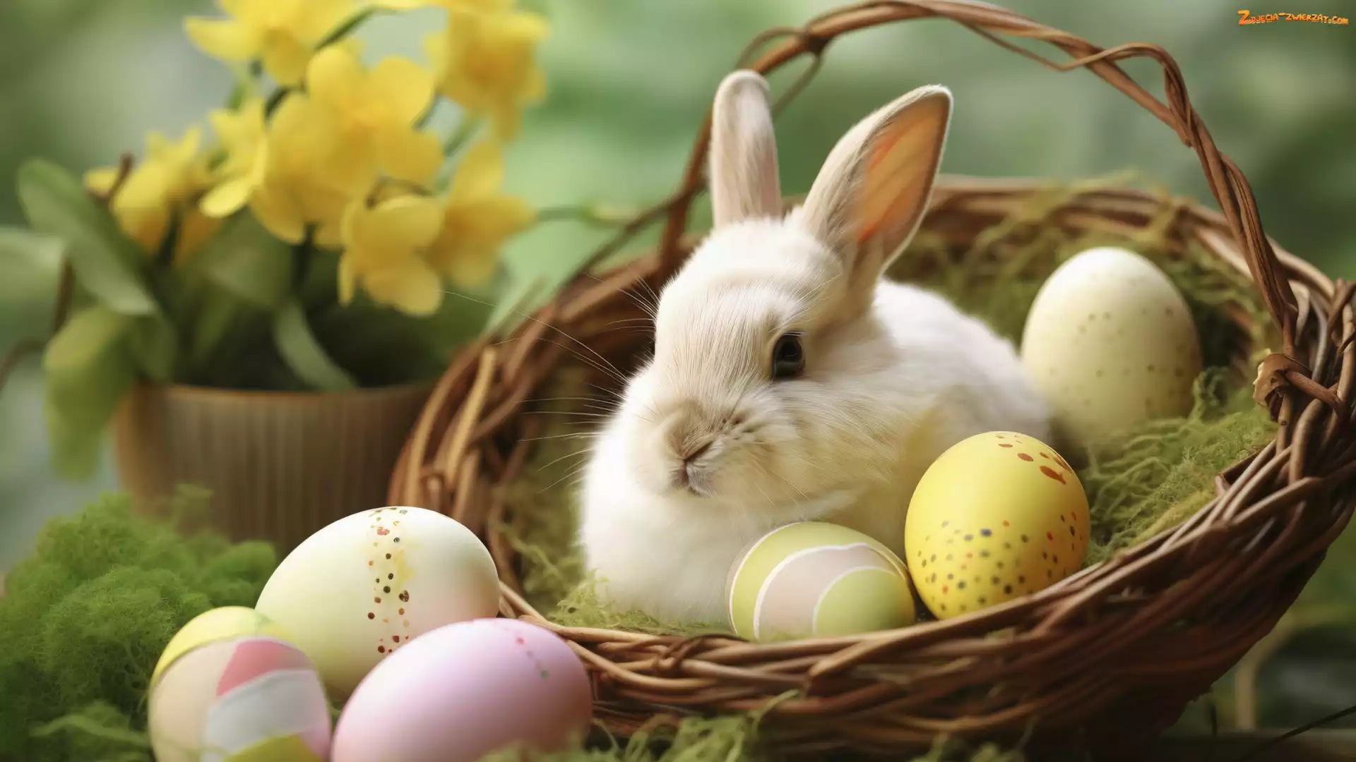 Zdjęcie: Wielkanoc, Kolorowe, Biały, Królik, Pisanki, Koszyk