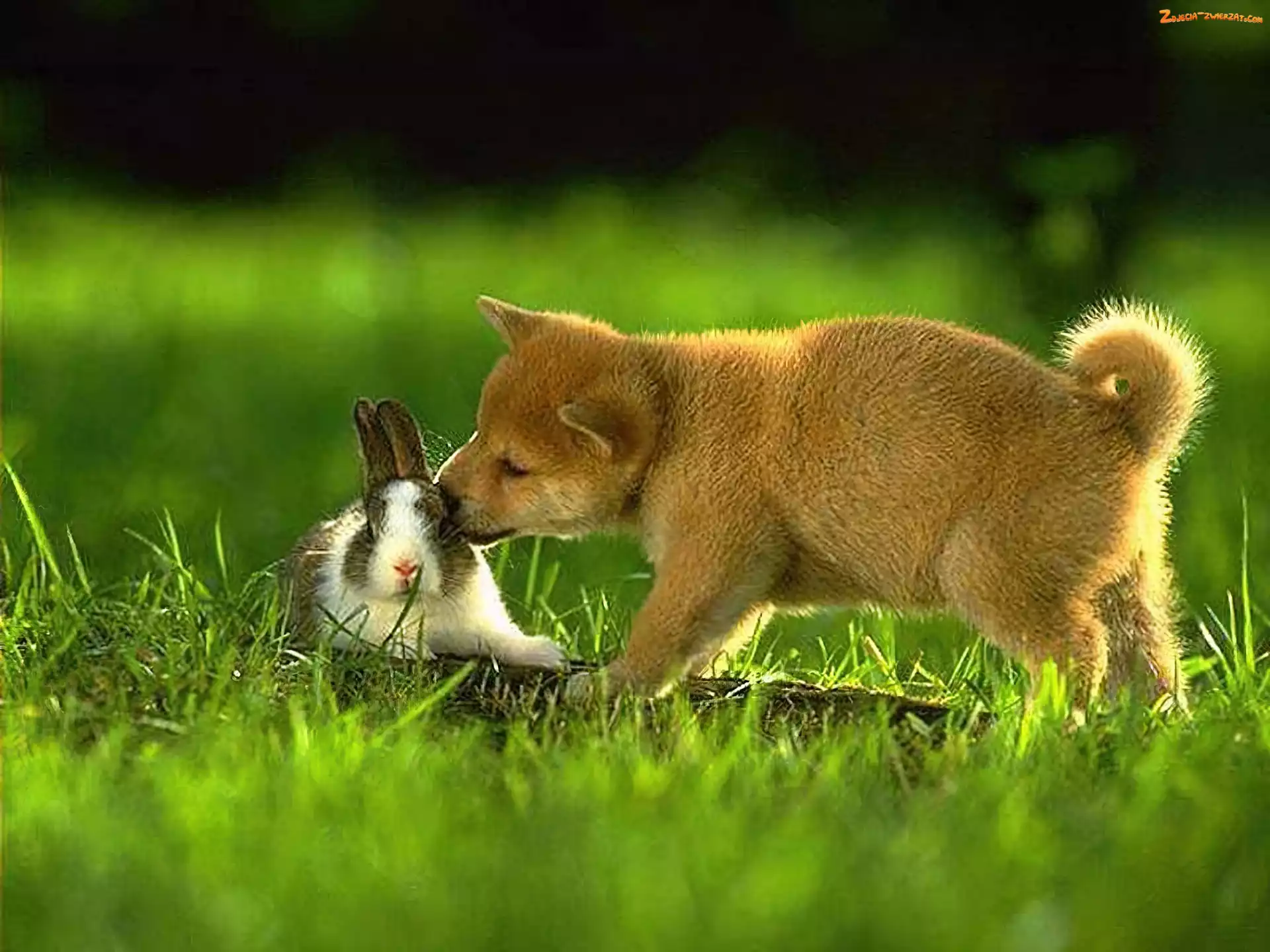 Zdjęcie: Pies, Akita, Królik, Trawa