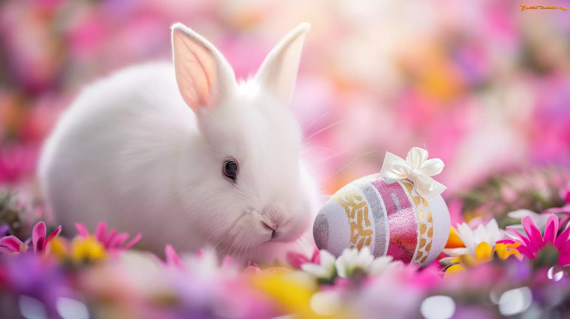 Zdjęcie: Grafika, Pisanka, Biały, Królik, Kwiaty, Wielkanoc