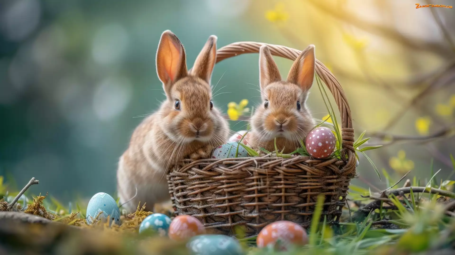 Zdjęcie: Wielkanoc, Koszyk, Dwa, Króliki, Pisanki, Kwiaty