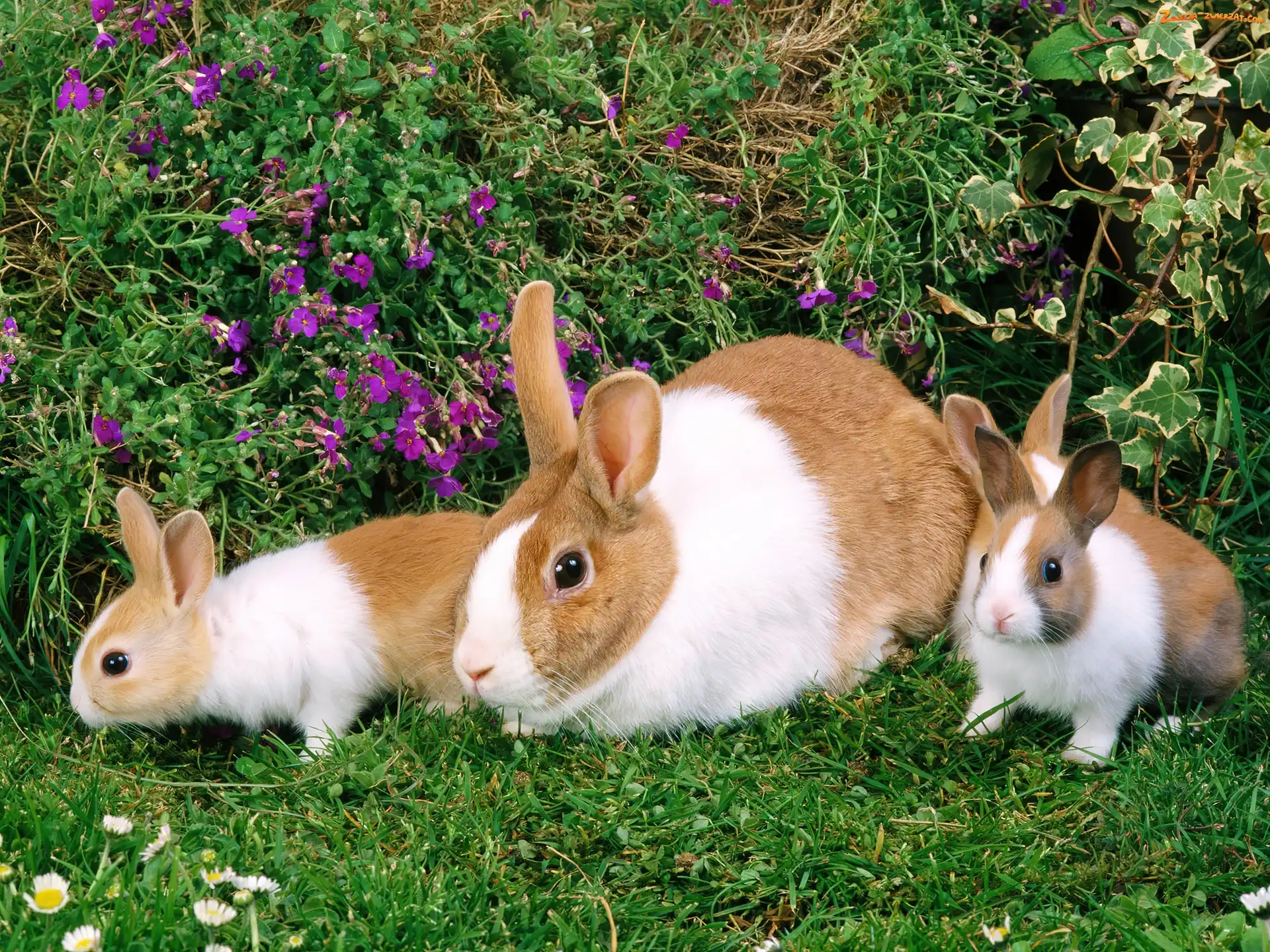 Zdjęcie: Króliki, Kwiatki, Trzy, Trawa